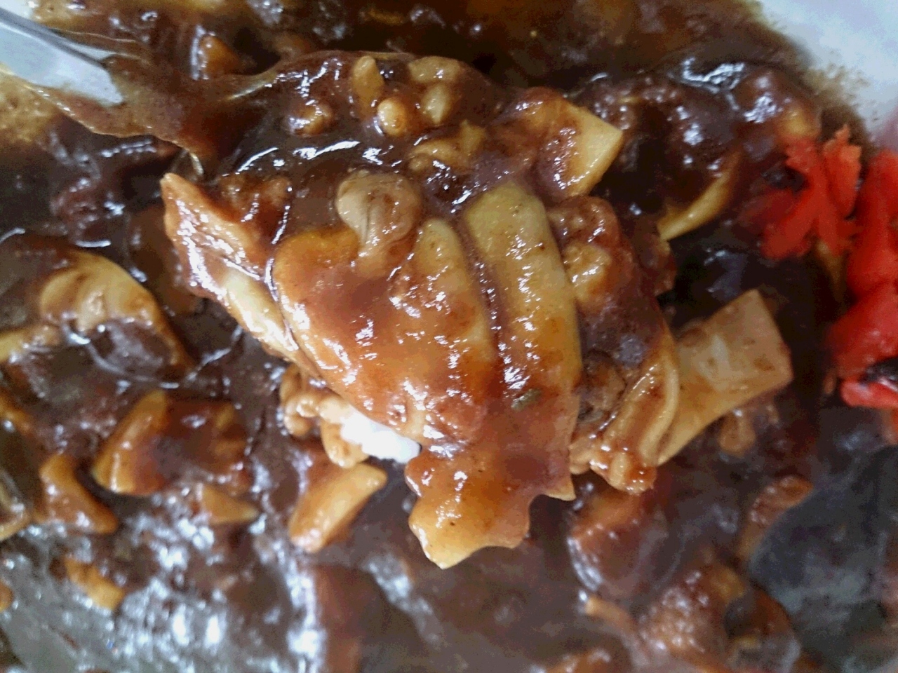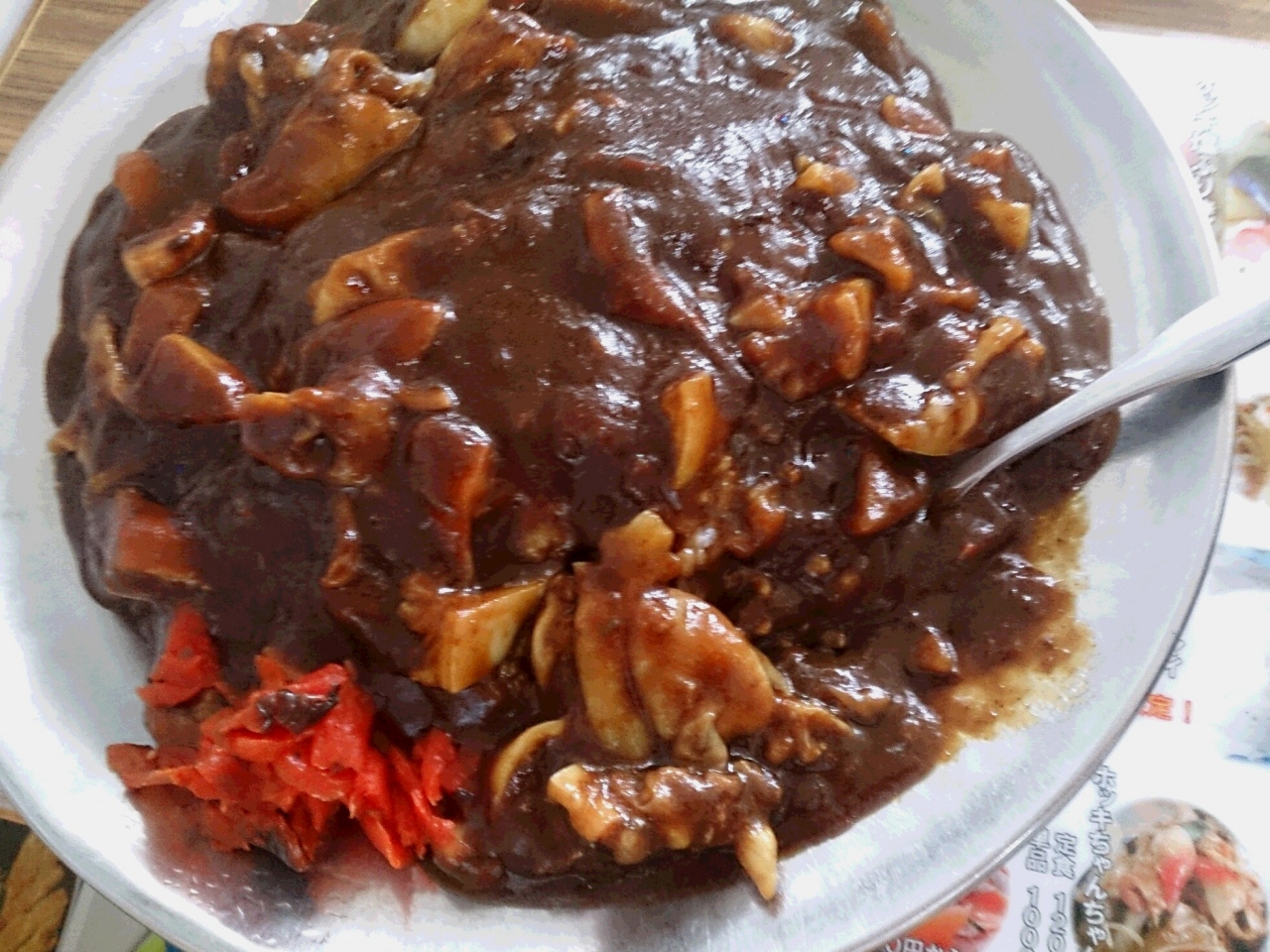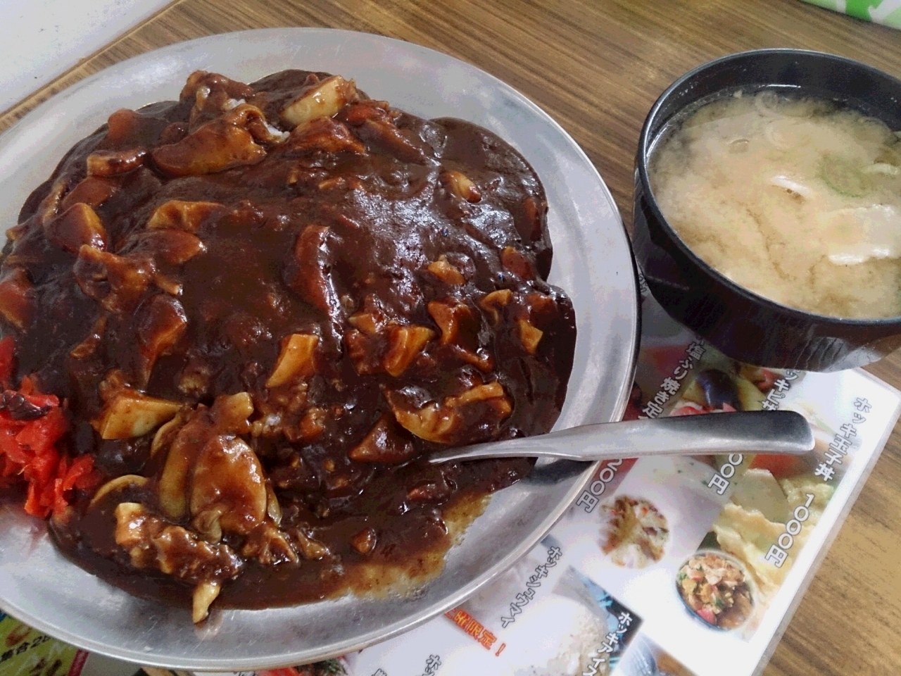 JR八雲駅のすぐ目の間にある食堂です。民宿もやっているらしく、大きな構えの食堂です。国道や高速道路から離れているので、車で行くと素通りしてしまう町です。しかし、ここに日本で唯一のカレーを発見。それは二海カレー。八雲町は、日本で唯一、日本海と太平洋に面している町です。その日本海の特産タコと太平洋の特産ホタテのフライが入ったカレーです。しかも、もう一つの特産、牛乳で作ったカレーで見た目はシチュー見たいです。でも、ピリッとカレーの辛さはあります。何の期待もしないで入ったお店ですが、意外なグルメをいただくことができ、感激しました。