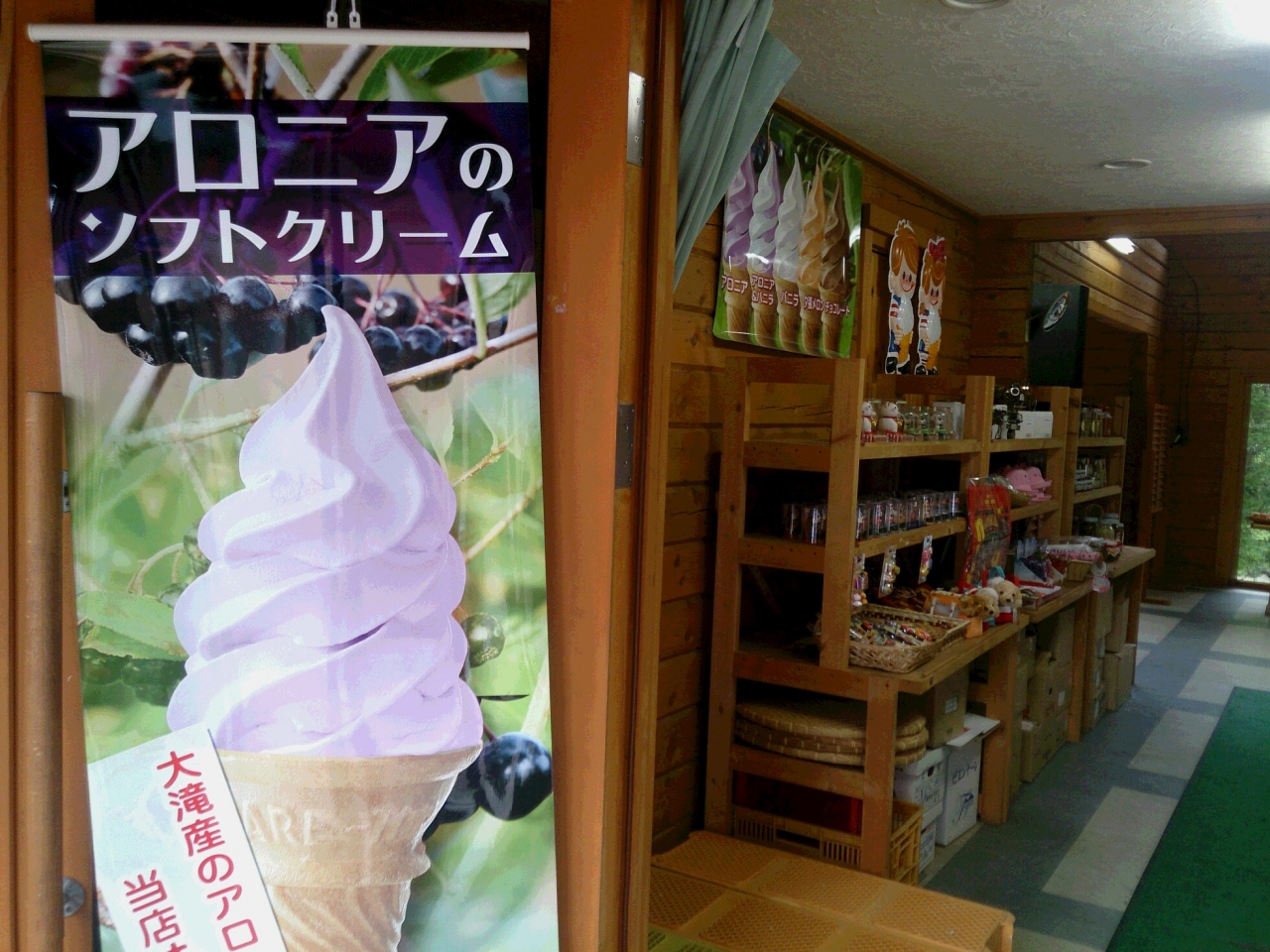 道道86号線沿いにある伊達市大滝の三階滝公園の中にある売店です。ここは、アロニアという果実が特産らしく、アロニアのジュースやお菓子がありました。中でもおすすめは、アロニアソフト。アロニアの酸味が生かされた、さっぱりした味に仕上がりおいしいソフトクリームです。しかし。場所が目立たない。あまり立ち寄る人もなく閑散としています。この売店の、営業時間も、午前9時から午後4時と短いです。もう少し、観光客のことを考えてほしいです。
