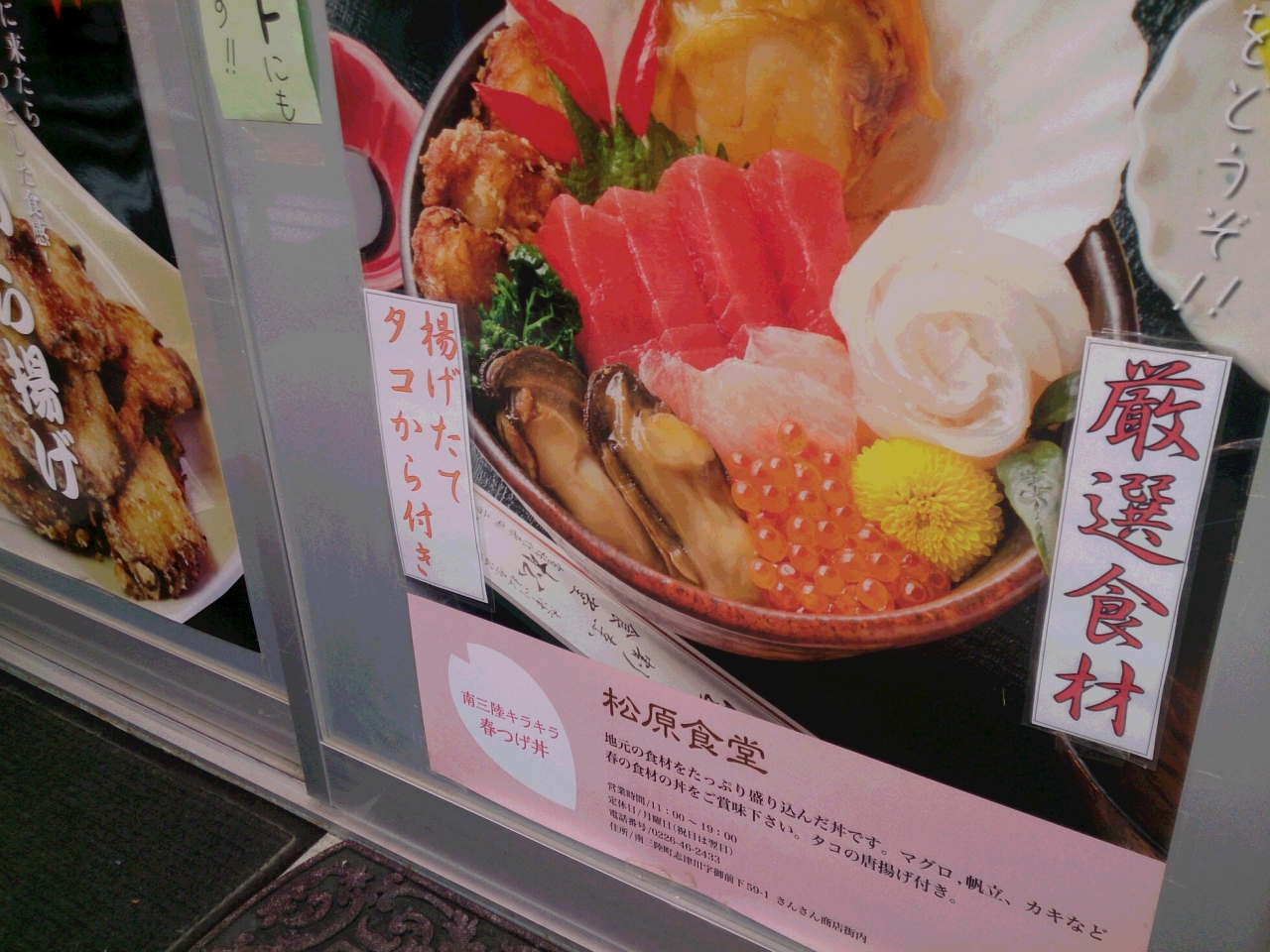 南三陸は、復興に向け新グルメ「キラキラ丼」が有名ですが、普通の刺身もおいしいです。ここの店では、刺身とから揚げが一緒になった「春つげ丼」をいただきましたが、やはり刺身は刺身だけのほうが良かったです。味が混ざって微妙でした。地元の人が多かったせいか、あまり海鮮を食べている人はいませんでした。営業時間は、午前11時から午後7時までですが、昼すぎに閉めていることがあります。ご注意を。