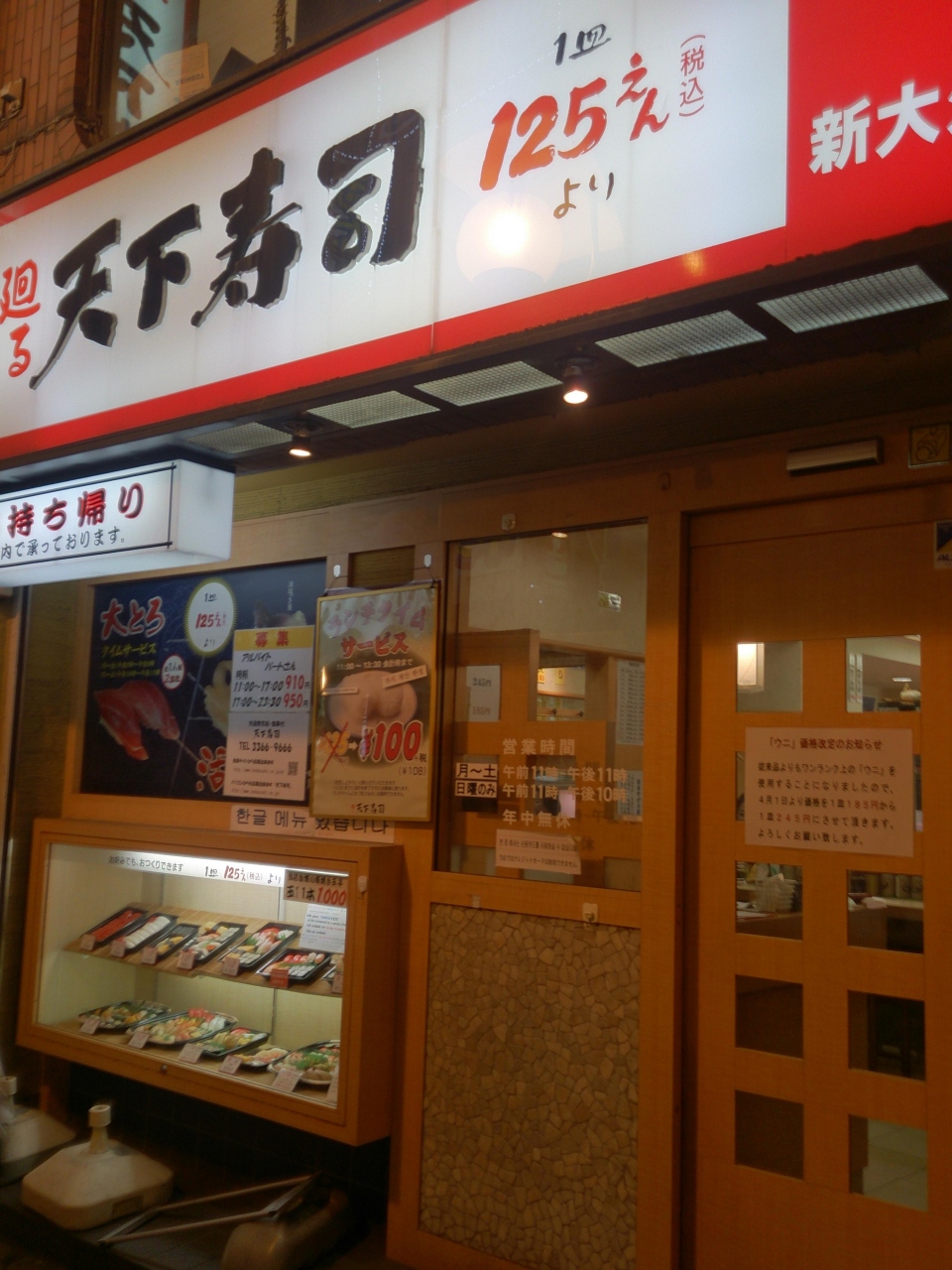 JR新大久保駅から歩いて5分、東南アジア系外国人が多い街の回転寿司屋さんです。回転寿司ですが、ネタの良さでは定評があります。寿司屋の定番、まぐろやサーモンからウニなどの高級品まで、おいしいです。最近、ウニの値段が上がりましたが、納得です。また、ハワイ巻きやカリフォルニア巻きのような洋風寿司もあり、大変おいしくいただけます。営業時間は、平日午前11時から午後11時までです。