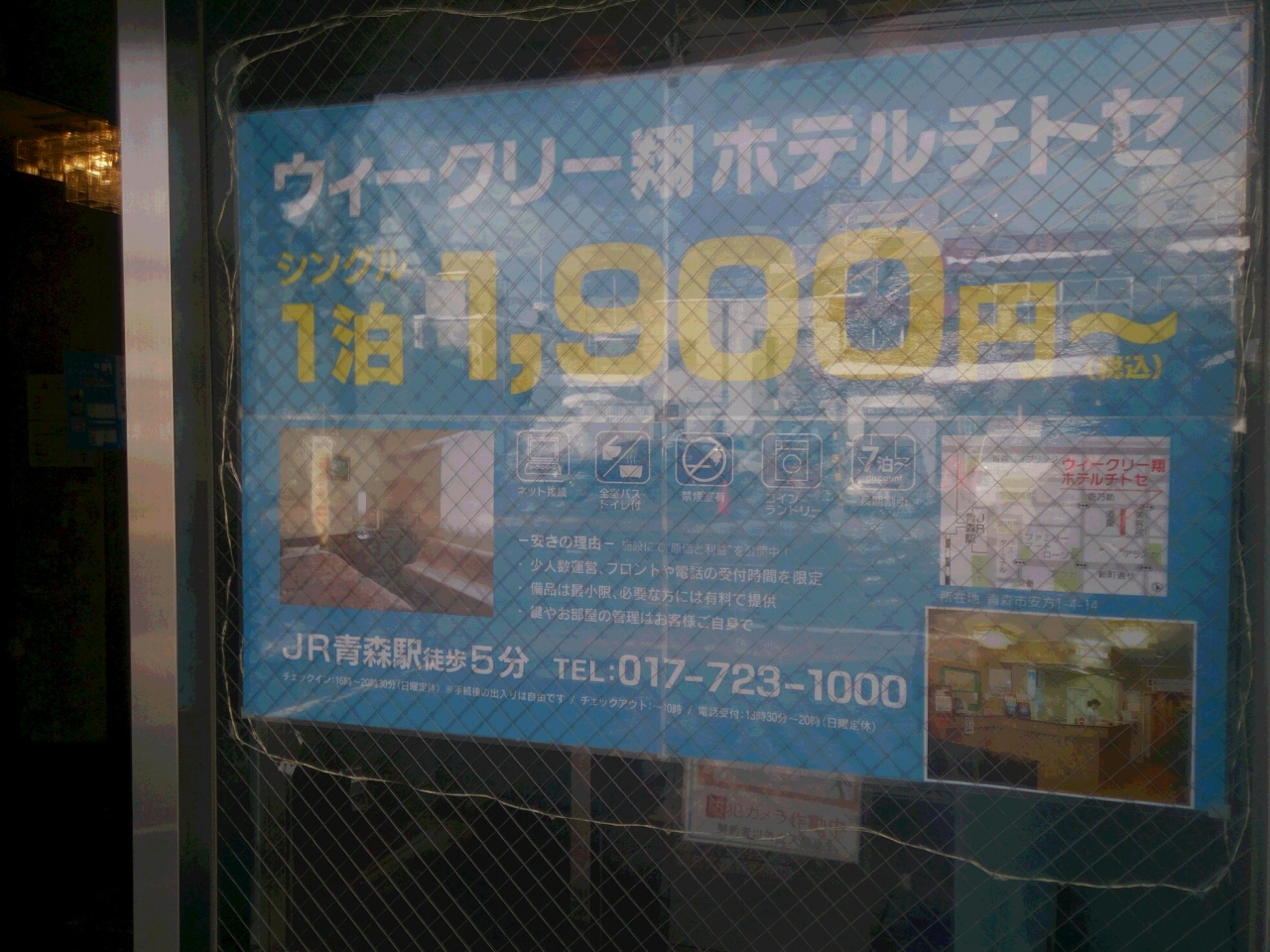 JR青森駅から歩いて1分少々。しかも安い。ツインに泊りましたが、大きさの違うベッドが部屋に2つ。歩くスペースもありません。他の部屋を見ると、「トイレわけあり」「騒音のわけあり」もう笑うしかありません。それを承知で泊るのですから、文句は言えません。古いですけどスタッフは親切でした。(呼んでも、どこにいるかわからなかったけど)良い旅の思い出です。