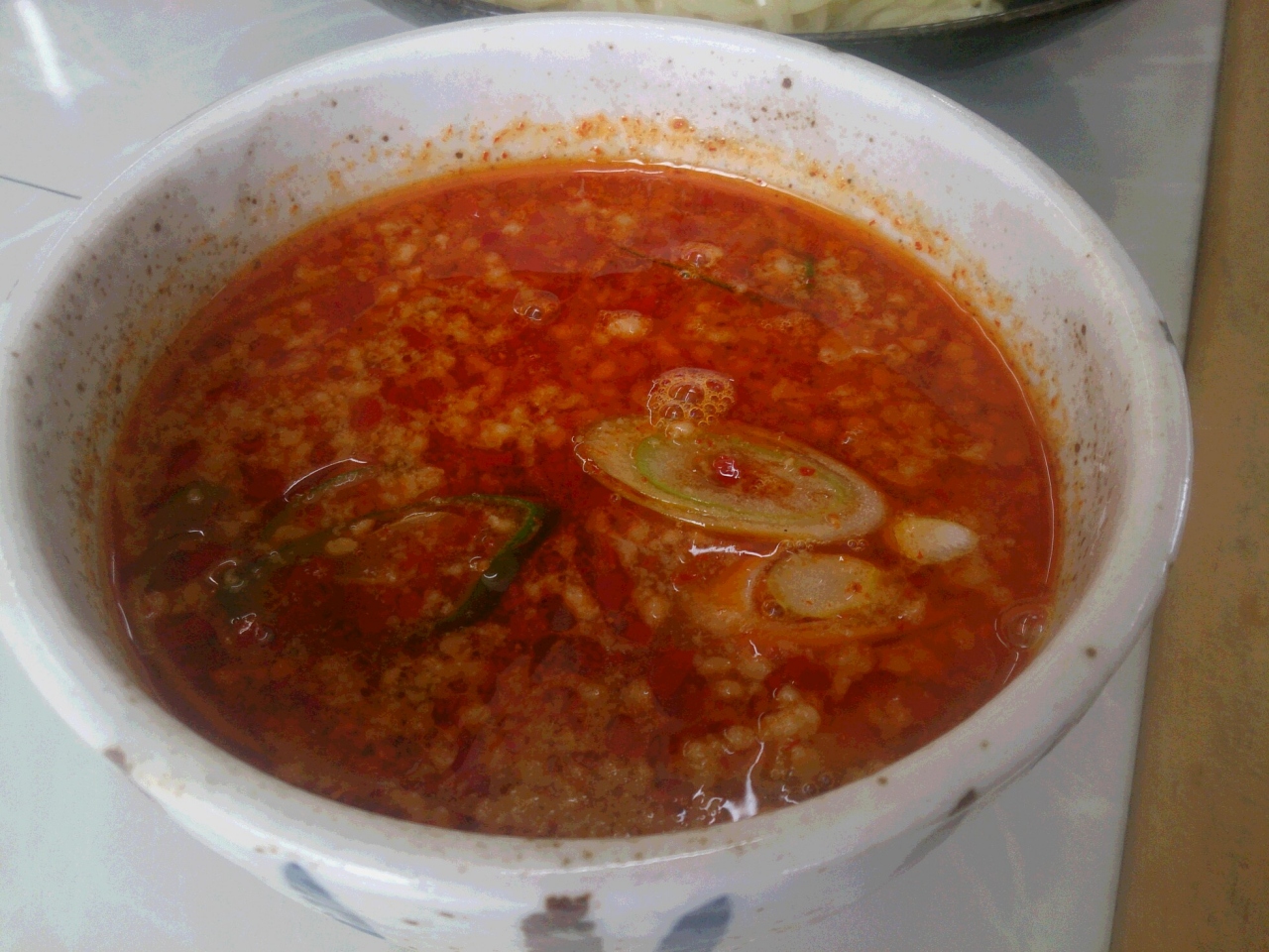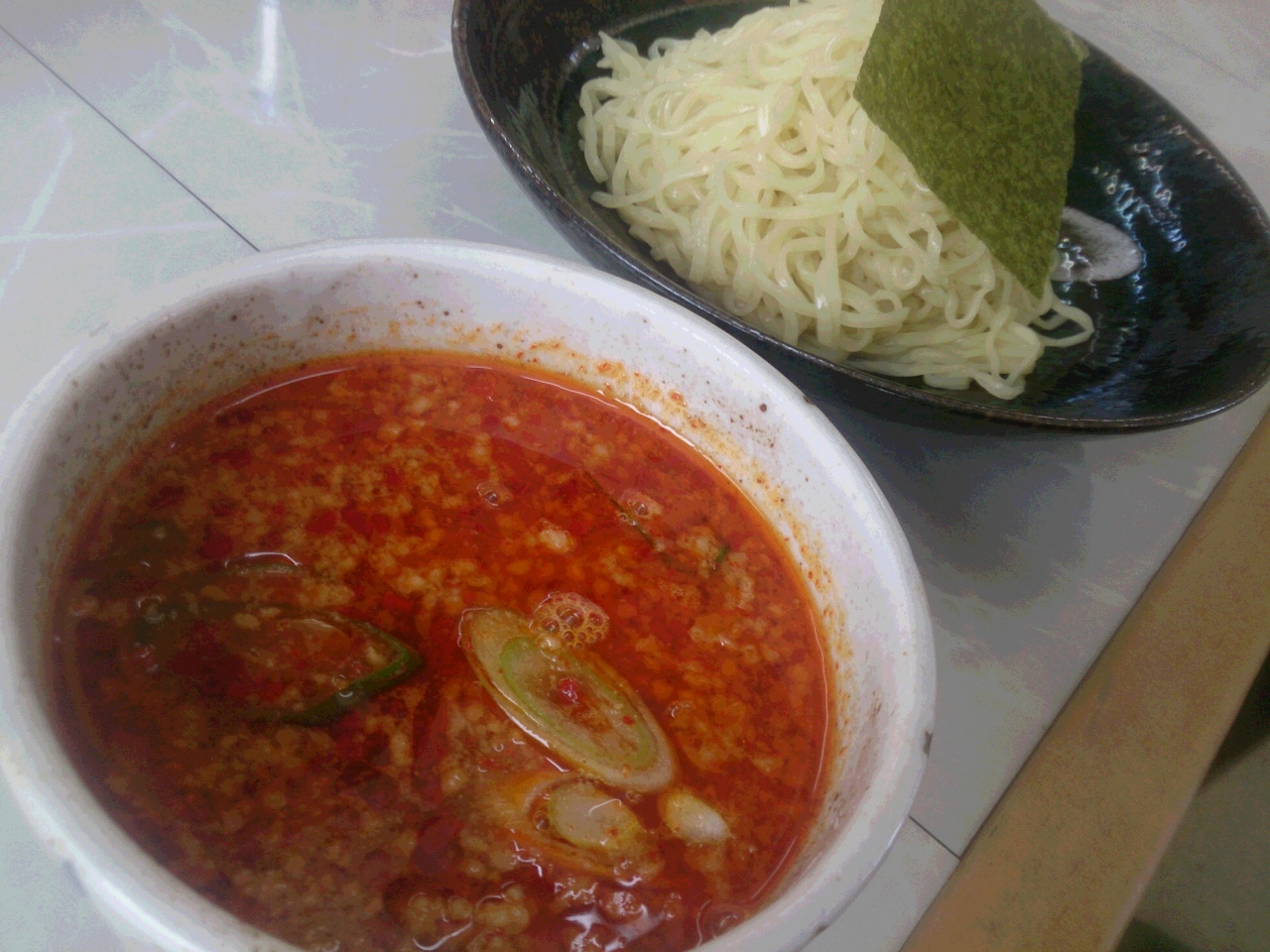青森のカーリングホール、「みちぎんドリームスタジアム」から歩いて10分ほどのところにあるラーメン店です。この体育館の近くに飲食店はありません。行ってみると親子連れなどで大人気。みんな車で遠くから来ているようです。カウンターに座ってメニューを見ると醤油屋というだけあって2種類の醤油ラーメンがありました。でも、つけめんにひかれ、ピリ辛スープのつけめんを注文しました。出来上がる前に、食べ放題の自家製漬物をいただきながら待ちます。おいしい漬物で、青森はこんなサービスがあるのかと感心しきりでした。ほどなくしてつけめん登場、見た目もおいしいそうで、赤い色のピリ辛スープがさらに食欲をそそります。麵は平べったい自家製麺で味ものど越しも良かったです。麵を食べ終わるとスープ割りもいただき、とても温まりました。