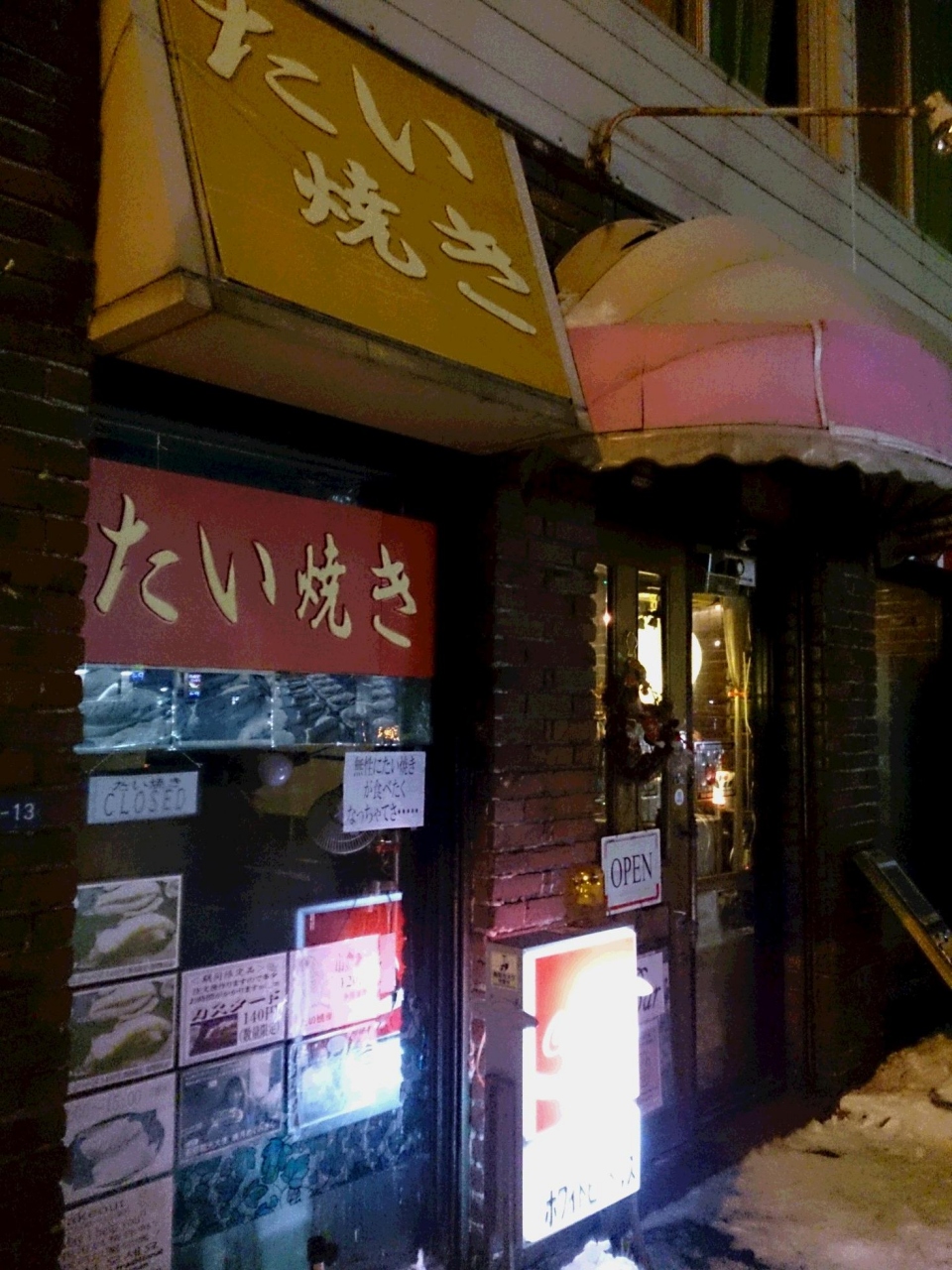 一番最初に目に入ったのが、「たい焼き」の看板。たい焼き屋さんだと思ったら、中には男性が2人。周りには、数本のギター。間違えた…。立ち去ろうとすると「たい焼き、やっていますよ」と一人の男性が言う。ただし、昼の12時から午後3時までということでした。何も頼まず、立ち去るのも悪いので、ビールを1杯いただきました。次の日無事、おいしいたい焼きを買うことができましたが、調べてみると「ソバ」もおいしいということでした。また、夜行かなければ!
