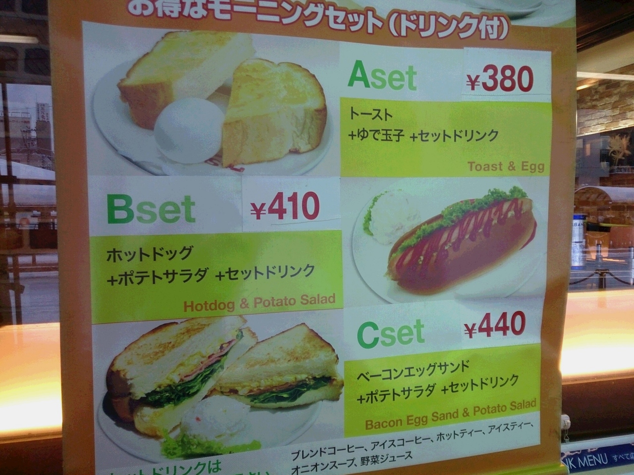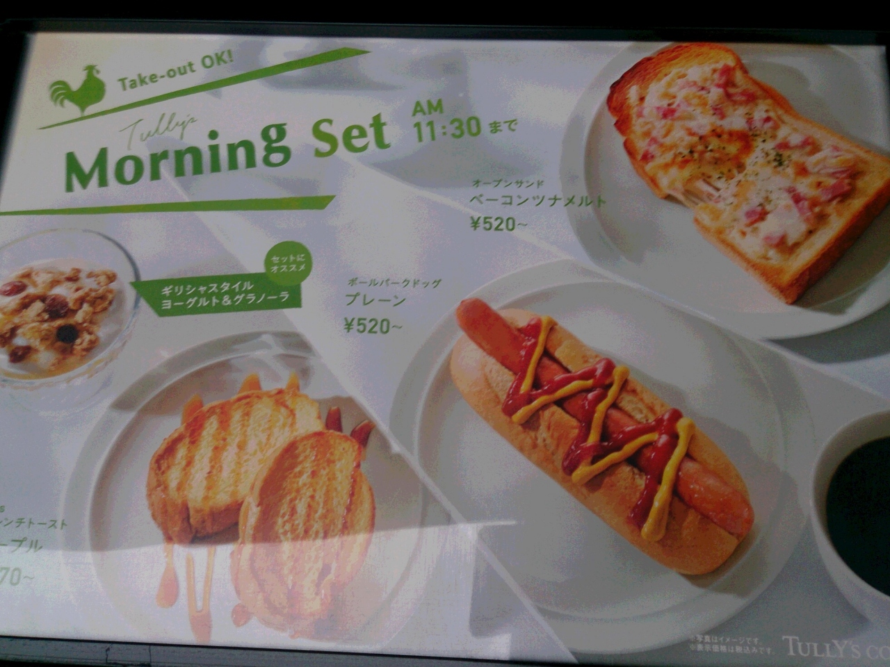 駅によって「ちょっと朝食を」と探したところに見つけたタリーズコーヒー。広くて、朝から人も入っています。モーニングセットが充実しているので入りましたが、周りはタバコを吸う人だらけ。禁煙席はないのか聞いてみると一部の席で、しかも分煙しかないと言うのです。せっかくコーヒーをいただくのに、タバコの煙が漂うのは嫌なので、結局、持ち帰りのコーヒーのみにしました。禁煙フロアを設けるのは、時代の流れだと思います。