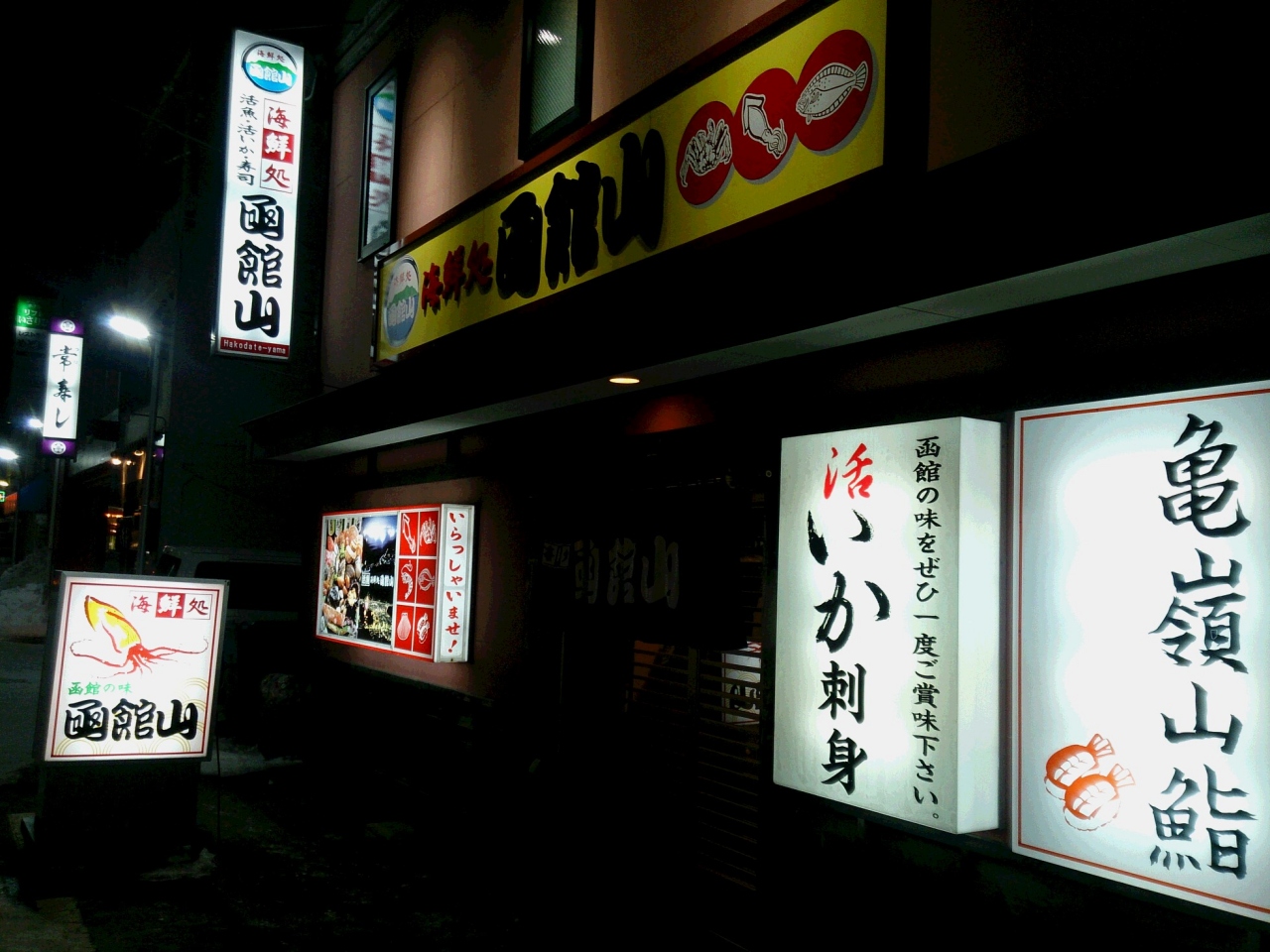函館に来たら、やはり海鮮が味わいたい。しかし、着いたのは夜遅く。どこがやっているのか、どこかおいしいお店はないのか、タクシーの運転手さんに聞くと「函館山」という答えが複数聞かれました。行くしかない。行ってみて大正解。刺身がうまい。特にこの時期にとれるイカの刺身やサンマの刺身で感激しました。看板にある「海鮮処」はウソではなかったです。握りも、軍艦からイクラがこぼれていました。たいへん満足で、ここを教えてくれたタクシーの運転手さんに感謝します。営業時間は、午後5時から翌朝の13時までです。月曜日が休みです。