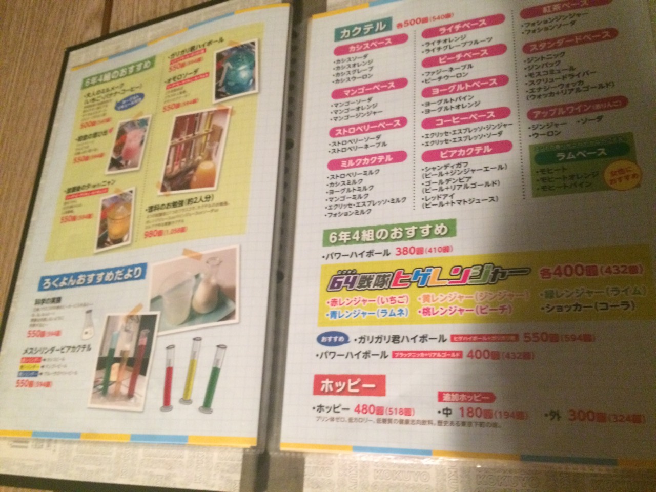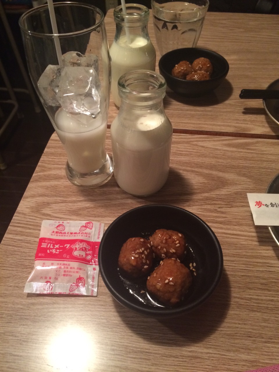 居酒屋ですが名前のとおり、給食が出ます。ビールも注文したのですが、まず味わいたかったのが、ミルメーク。牛乳に入れるあの粉ですね。思わず「懐かしい、これこれ」と叫んでいました。ビールを飲む前に牛乳を飲むのことは、絶対しないのですがここではやってしまいます。そしてミートボールに、茹でて少しのびたスパゲッティ。のび加減が懐かしい。次は、揚げパンきなこ。これは、お土産に持って帰ることに。最後は、冷凍ミカン。これが出たときにはクラス中大喜びだった事を思い出します。途中で音楽のテストがあったり、普段は「こんなもの!」と思うような味が懐かしく味わえます。営業時間は、午後5時から午後11時30分まで。休校日もあるので電話などで問い合わせると酔うでしょう。こちそうさまでした。