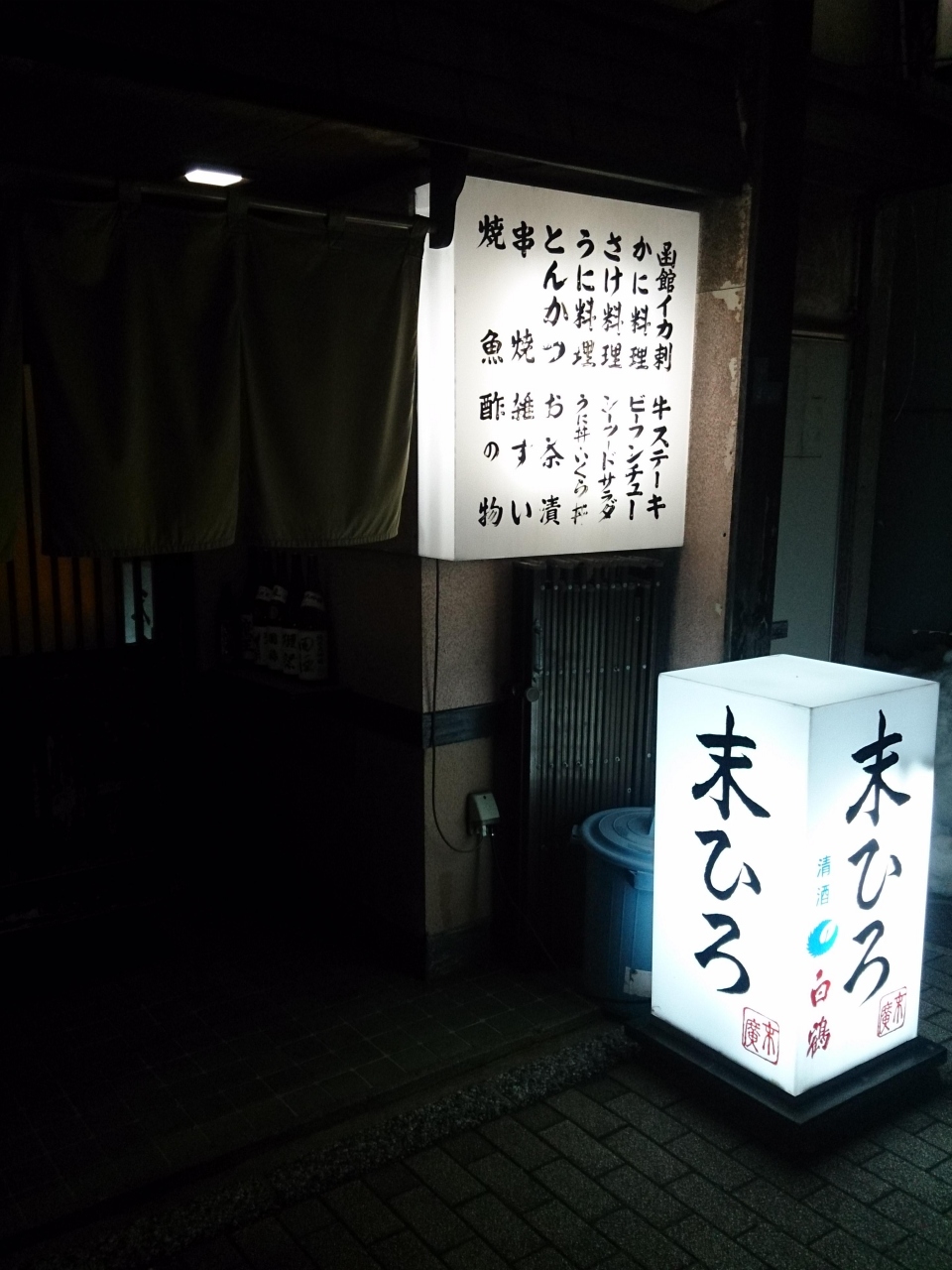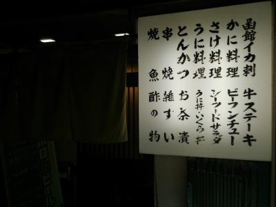 函館の町を歩き、この店に入りました。看板に「函館イカ刺し」「ウに料理」の他に「牛ステーキ」のほかに「ビーフンチュー」?シの点が取れたのか、と興味を引いたので入りました。何の変哲のないカウンターに座り日本酒を注文しようとサケの棚を見ると「ん?」青森の田酒があるではないか。わざわざ津軽海峡を越えてきたのであれば頼まなければなるまい。さっそく田酒を注文。つまみには、悩みました。何しろ他の客が注文した「トンカツ」や「ビーフンチュー?」があまりにもおいしそう。結局、おなかがあまり空いていないにも関わらず、「トンカツ」と「ビーフンチュー?」と「イカ刺し」を頼みました。もう満腹、満腹。ご馳走様でした。