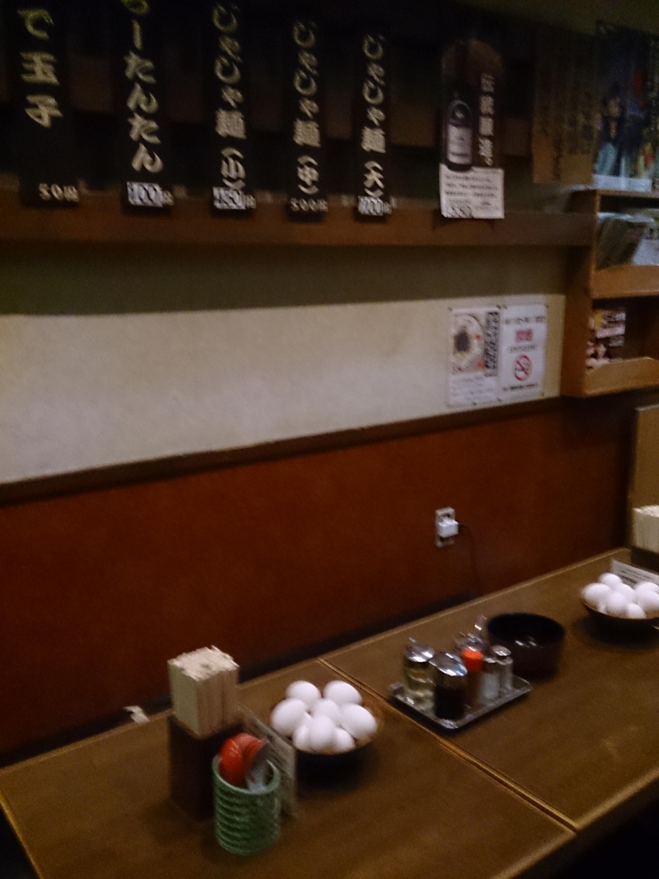 盛岡に来たら食べたいのがジャージャー麵。個人的には冷麺やわんこそばよりジャージャー麵です。有名店が早い時間に店じまいするため、ホテルのスタッフに「遅くまでやっていておいしいジャージャー麵がいただける店は?」と聞いて教えてもらったのが、この店。さっそくいざ、ジャージャー麵を注文すると…。あらっ、ジャージャー麵でなくじゃじゃ麵なの?「じぇじぇじぇ!」という感じ。そうこうしているうちにじゃじゃ麵登場。このお店は各テーブルに、追加用の味噌ダレがのっているので嬉しくなります。ニンニクやラー油も加えてアツアツなじゃじゃ麵を満喫。そしてこれ、生玉子を混ぜてスープにしてもらう「チータン」も注文。これを味わいたいために、じゃじゃ麵を注文したのです。「チータン」もおいしく盛岡に来た目的を一つ達成した夜でした。営業時間は月から土曜日が、午前11時から深夜3時まで。日曜日は昼の12時から午後7時時まで。第2・4・5日曜日がお休みです。