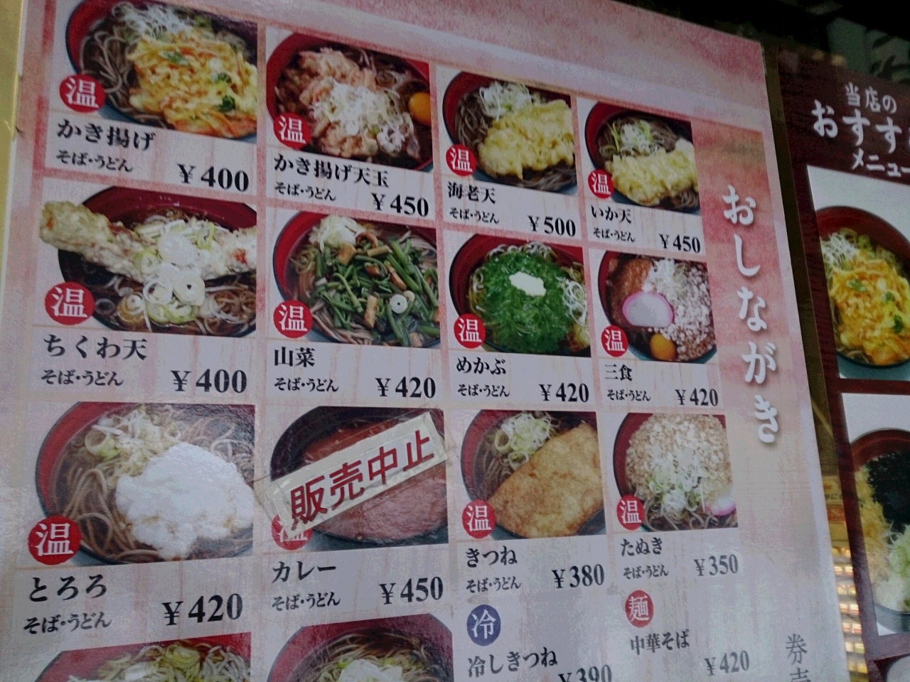 旅で時間のないときは、どうしても立ち食いソバになってしまいます。そんなわけでこの日は、観光に行く前に腹ごしらえ。種類は、そこそこ多いのですが冷たい面が少ない。個人的にとろろや海老天も冷たい麵で味わいたいほうなので、あたたかい麵しかないのは、「ちょっと」という感じです。最近はファストフード店やカフェでも持ち帰り商品が増えているので立ち食いソバ屋さんも工夫が必要だと思います。