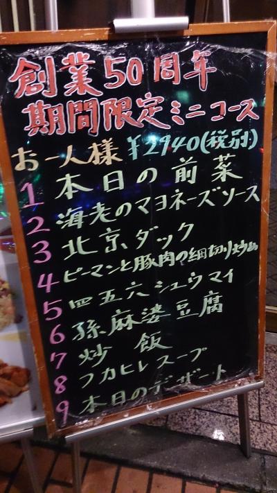 横浜中華街の善隣門のすぐ近くにある上海料理店です。ここには珍しい上海料理の麻婆豆腐があります。お店ができて50周年と言う事で特別コースがあったので寄ってみました。このコースにも麻婆豆腐がありましたが、唐辛子の辛さしかなく麻婆豆腐本来の山椒の辛さがありませんでした。やっぱり山椒の辛さでないとおいしさは感じられませんでした。50周年企画のコースは量もあって良かったです。