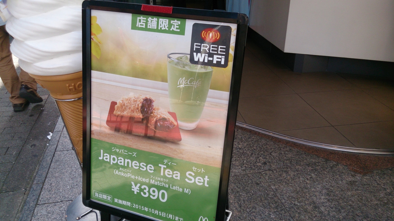 新宿駅から、歩いて5分。道路に面したオープンカフェのようなマックです。休むというより、立っておしゃべりをしながら、飲み物をいただくというスタイルです。場所柄、外国の方が多くにぎやかです。そのためか、ここには店舗限定商品、「ジャパニーズ・ティセット」がありました。マックにしては粋なメニュー。さっそくいただきました。暑いときには、やはりお茶がいいですね。アンコのパイもおいしく元気になります。