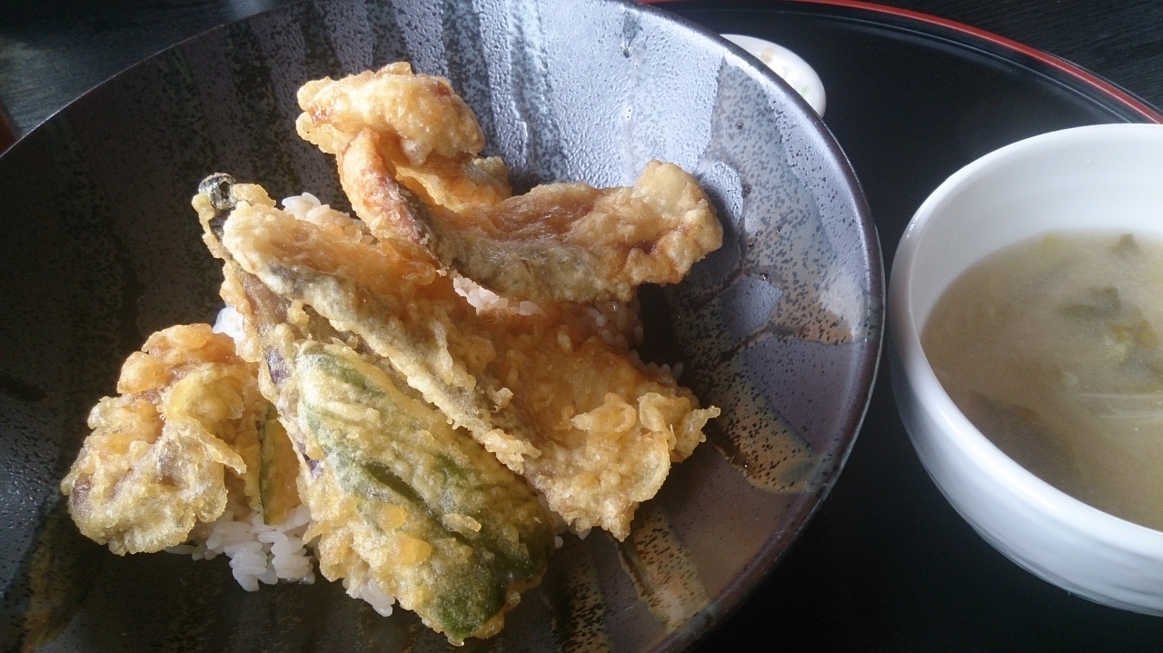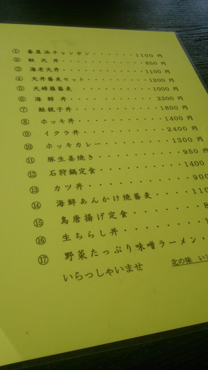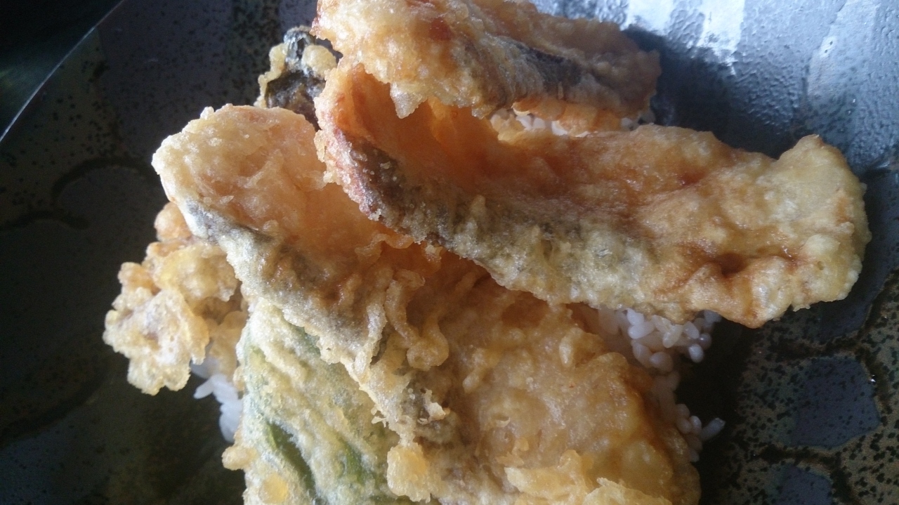 石狩市の石狩浜海水浴場あそびーちの入り口にある食堂です。「海の家では食べたくない」「番屋の湯の食堂は…」という人には、ここくらいしかあません。この地域に選択の余地がないのです。のぼりには、海鮮丼とチャンポンとあります。選択の余地がないので入ってみると、テーブル席がたくさん。一番奥の席に入ってメニューを見ると、少し高い。ほとんどが1000円以上です。あまりお金を使いたくないので、鮭天丼、880円を注文しました。待つこと10分。出てきました。大きな鮭の天ぷら3枚に、カボチャやナスなどの野菜天が入っていました。「おお!」と思い、食べると、タレも濃すぎずとても上品な味です。器も凝ったせとものの器でおいしさを演出。たいへん満足しました。少し高いとは思っていましたが、これなら納得です。また、寄りたい食堂です。