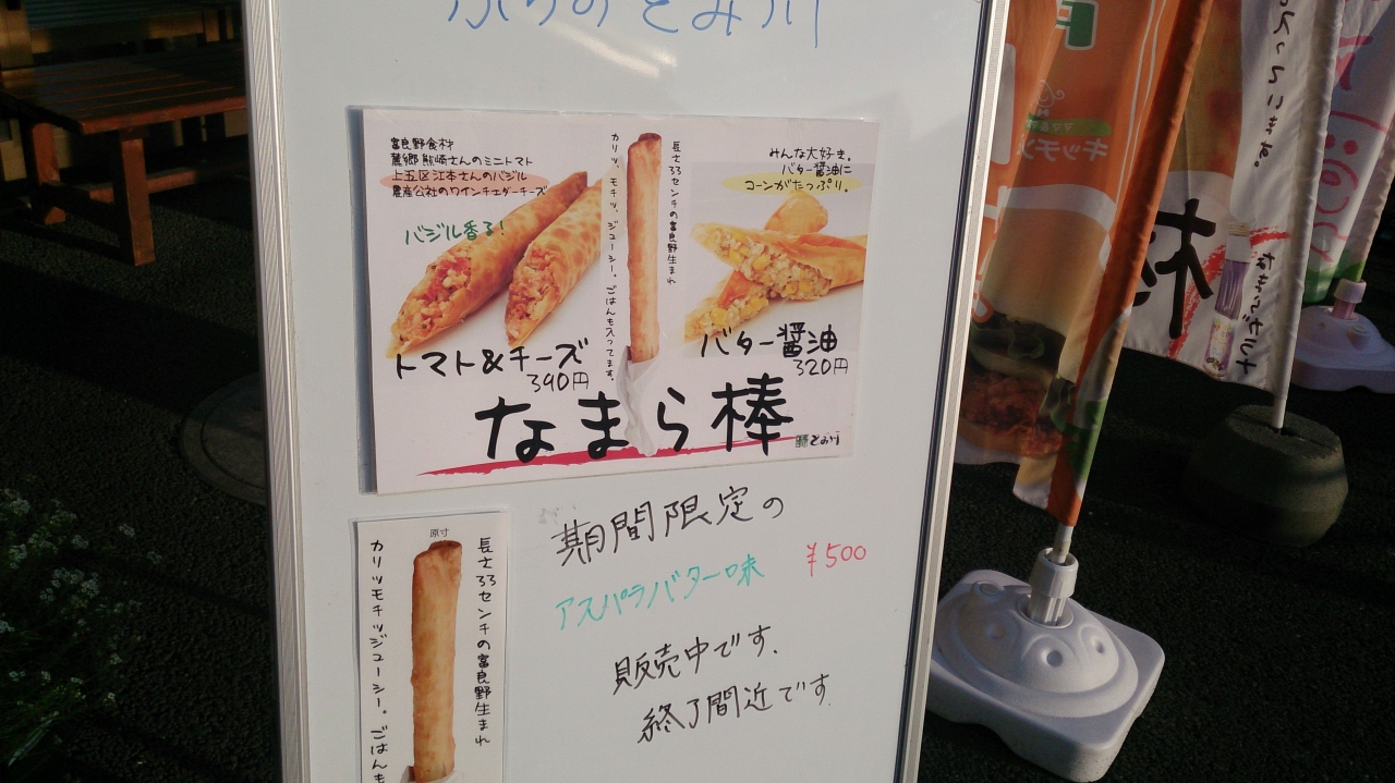 富良野のおいしいものがそろう「フラノマルシェ」。JR富良野駅から、5条通りを行くとあります。富良野の中心部の活性化と地元の食文化を楽しむために作られた施設は大成功と思います。今年の6月にはフラノマルシェ2もでき、賑わっています。営業時間は、午前9時から午後7時まで。しかし、遅く行くとあまり商品がありません。この日は、フラノマルシェの名物、なまら棒を買いました。最近はアスパラバター味など新商品も出ているのですが、最初に食べたときの驚きはありません。そして写真を撮ろうとした時、悲劇が起こりました。真ん中からポッキリと折れ落下。昔は、カラッと揚がっていて折れなかったのに…。2本目を買う気にもなれず向かいの店でパンを買いました。