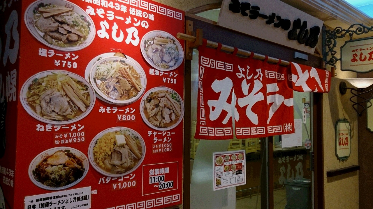 札幌のテレビ塔の地下1階にある旭川ラーメン店です。旭川ラーメンと言えばしょうゆ味ですが、よし乃さんは味噌が有名。ピリッとニンニクのきいたラーメンが特徴です。でも、旭川の本店に比べて、ニンニクの量が少ないような気がします。まぁ、昼にサラリーマンも来ますからしょうがないか。札幌の観光地に旭川ラーメンが進出したのはすごいとおもいます。営業時間は、午前11時から午後9時までです。