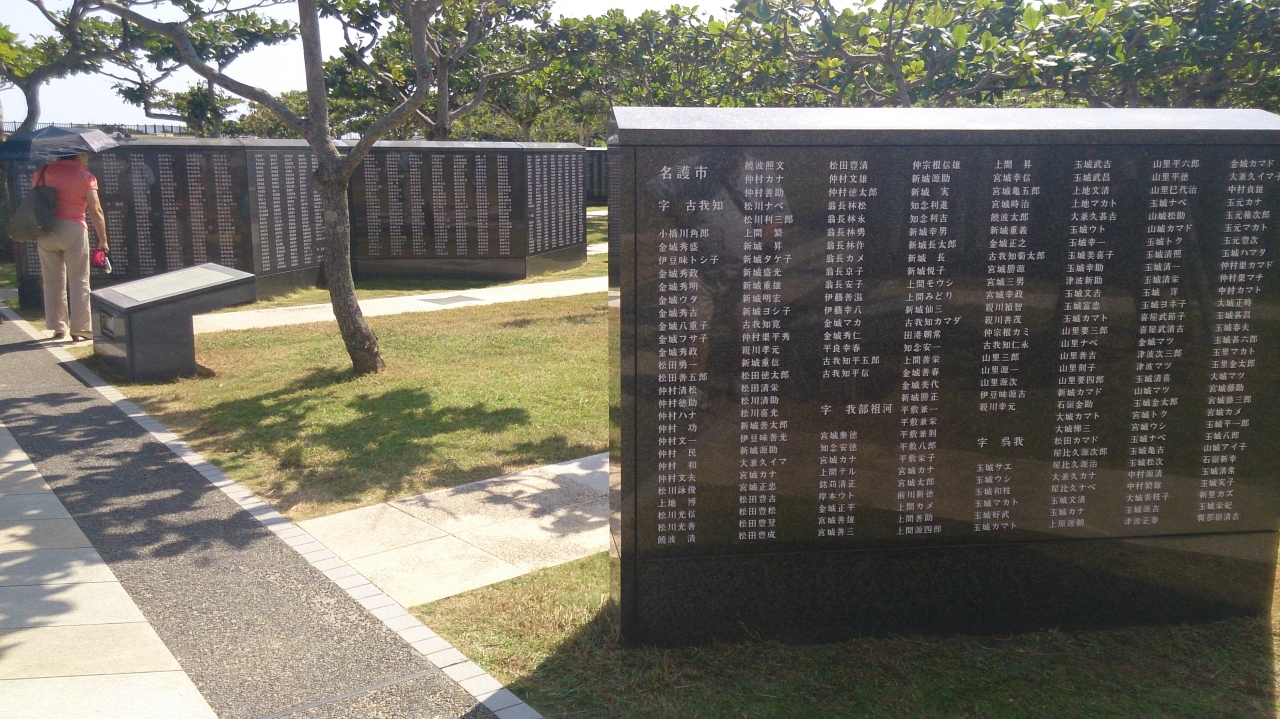 沖縄・糸満市にある平和祈念公園にある礎です。国籍、軍人、民間人の区別なく沖縄戦でなくなった方で同意を得られた方のみ、名前が刻まれています。礎は平和の広場を中心に放射状に広がっています。刻銘版は、1220面、約20万人の人の名前が刻まれています。平和祈念公園のホームページでは、「亡くなった全ての方」とありますが、ガイドさんの説明では、韓国の方など、日本の礎に名前を刻む事を拒否されている人もいるとのことでした。悲しく残念なことです。戦後、70年経っても、沖縄は侵略した国。これが戦争なんだと思いました。一人一人の名前を確認する事は、とても時間がかかり無理ですが、同じ故郷の人の名前を確認する事ができました。どんな事があっても戦争は、起こしてはいけないと思いました。