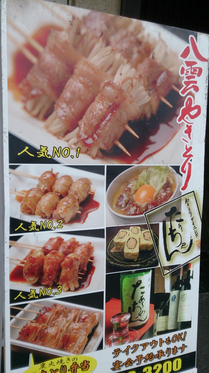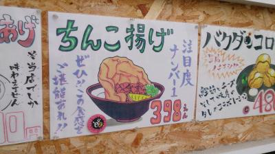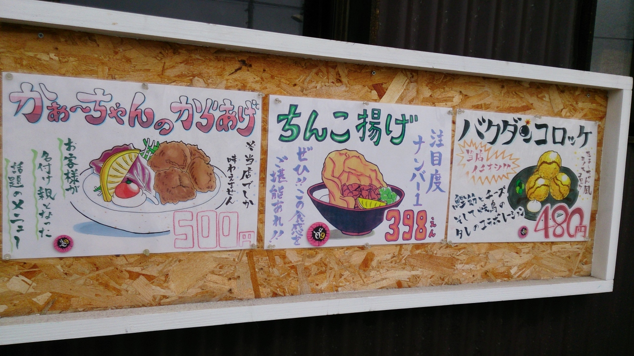 JR伊達紋別駅から歩いて10分ほどのところにあります。伊達郵便局の近くです。どこに入るか迷った末に決めたのは、このポスター!「ち〇こ揚げ」? 何なんでしょう?このメニュー!ついつい気になって入ってしまいました。焼き鳥や卵焼きもおいしかったです。それでこの気になる「ち〇こ揚げ」ですが、これもおいしかったです。何か確かめたい人は、行ってみてください。