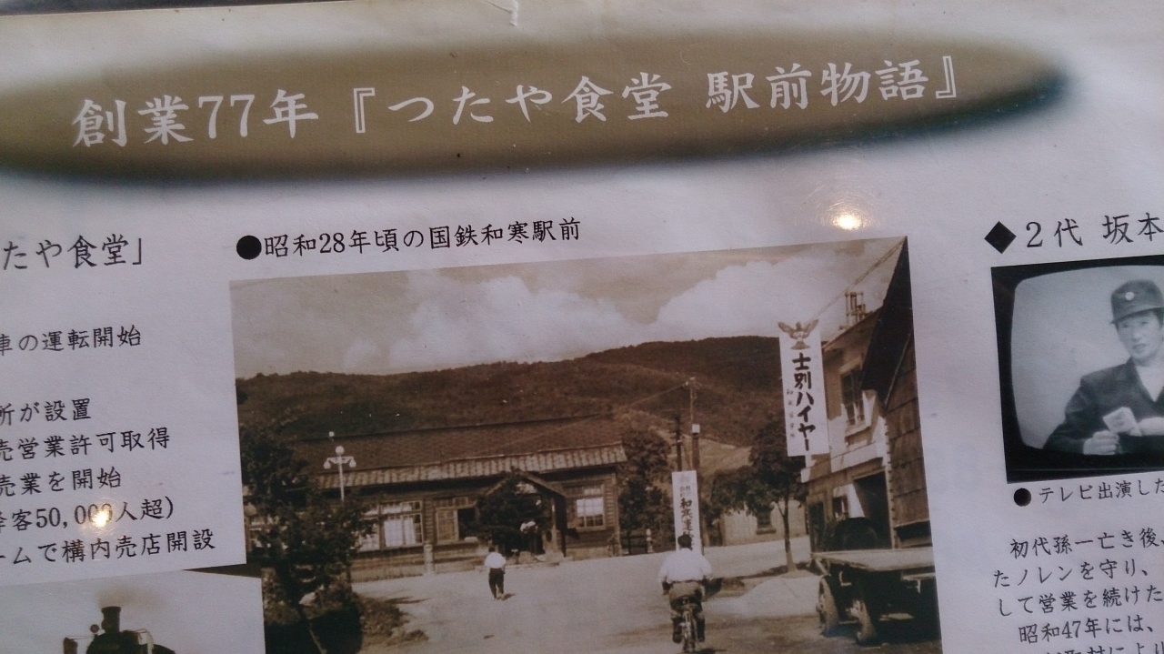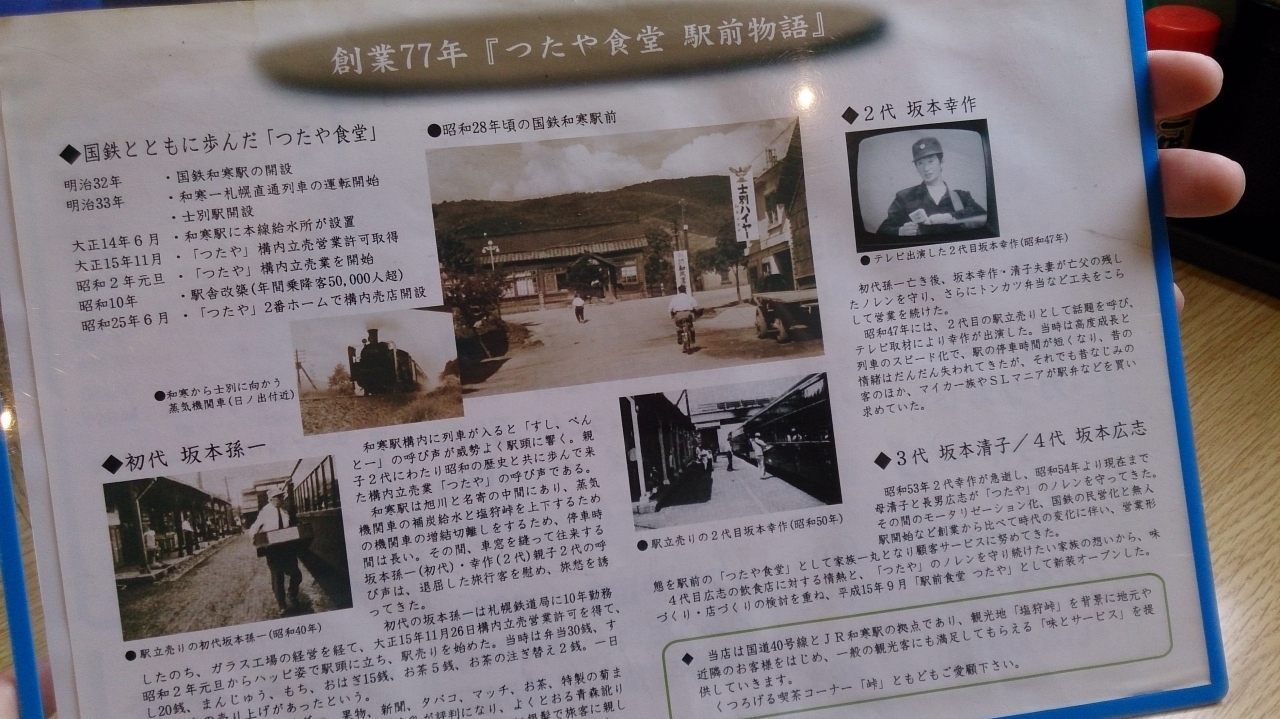 「醤油チャーシュ−メン」を注文。メニュー表の横にお店の歴史が書かれたものがありました。どれどれ。ラーメンが来る前に見てみると、大正15年に和寒駅の駅弁の立ち売りが始まりだとか。昭和10年には、年間5万人を超える人が乗り降りしていたといいます。繁栄していたのですね。現在は4代目のご主人だとか。そうしているうちに「醤油チャーシューメン」登場。メンは自家製といいますが、少しのびた感じ…。スープは、煮干しの香りも鶏がらの味もしない醤油。あっさりした感じですね。チャーシューはトロトロで柔らかく、しっかり味付けされたおいしいお肉でした。この肉を味付けた醤油がスープに使われているようです。昔ながらの味ですね。和寒駅から歩いて5分ほど。頑張ってくださいね。- 旅行時期