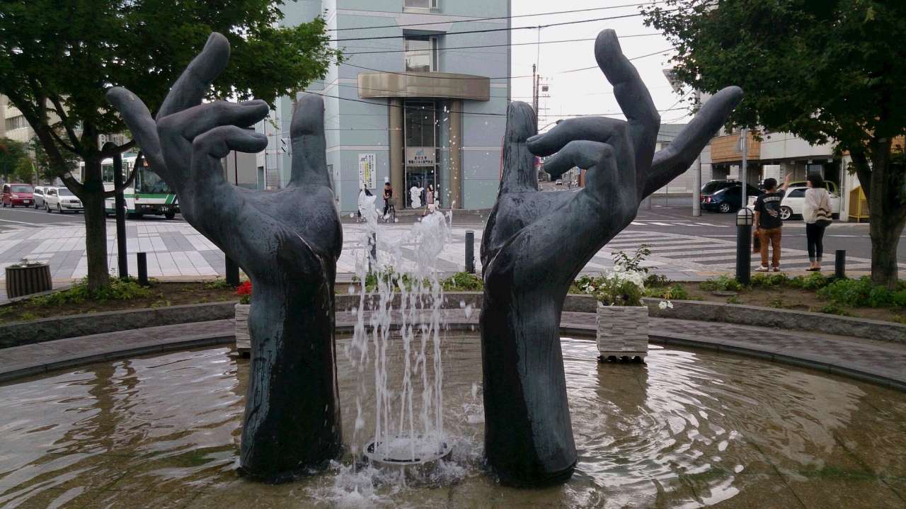 1972年6月1日に日本初の恒久的歩行者天国として開設されました。このときの視聴は、後の官房長官になる五十嵐広三さん。いろいろと国の役人が抵抗するなか、完成しました。その時の、五十嵐市長をはじめ市役所の方々、商店街の方、警察の方々に敬意を表します。そんな努力の末に勝ち取った日本初の公園だったのですね。今もいろんな彫刻や銅像があり、芸術の街、旭川を象徴した公園です。当初は駅前から8条通までだったのですが、延長され今は、9条通までが買物公園になりました。以前は、5条通にあった手の噴水が今は、8条通に移されましたが、ゆったりと噴水を眺められ、マイナスイオンを浴びながら読書もできるので、ここがいいかなと思います。買物公園は、その前に平和通という名前が付きます。昔は師団通といったのですが、戦後、平和を誓うために、この名前になりました。そんな歴史をかみ締めながら、歩いてみるのも良いですよ。