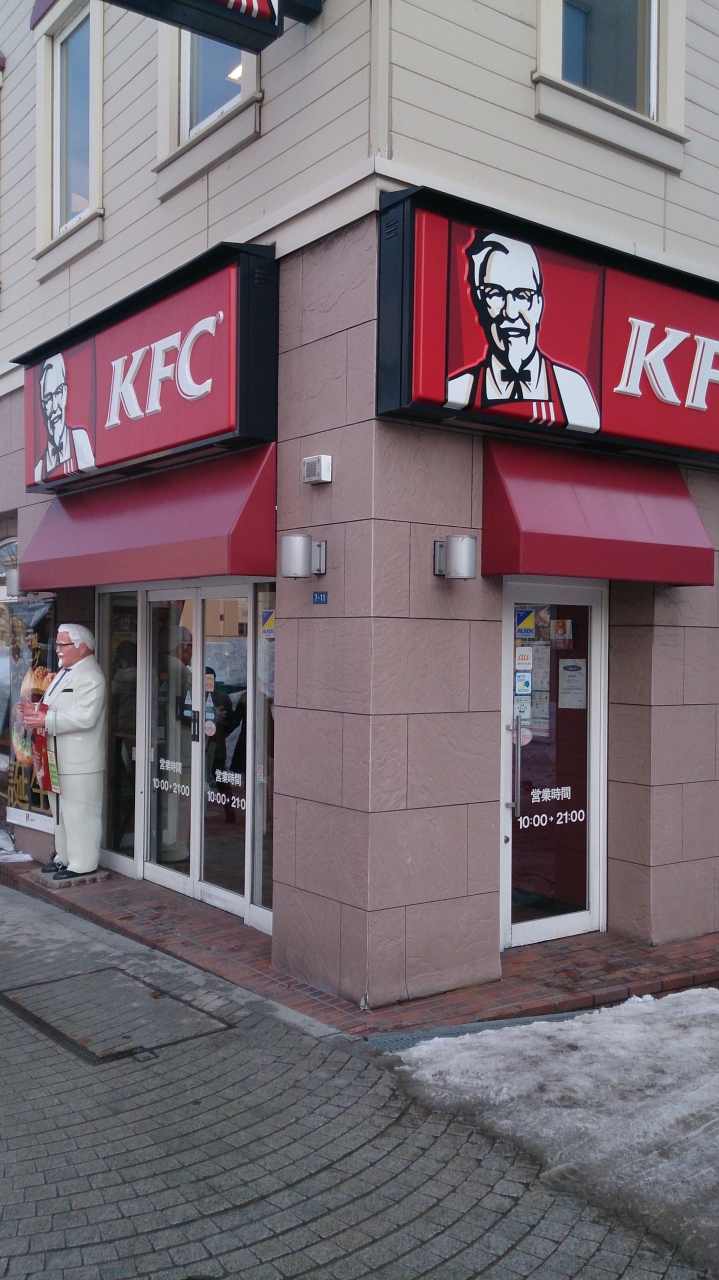 小樽の冬のイベント、雪あかりの路に行った時のこと。JR小樽駅から歩いて5分ほどのところにありました。店より目立つ「カーネルサンダースの雪像」思わず笑って店内へ。イベント期間ということもあって店内は混んでいました。席が空くのが待てないのでランチパックを買って冬の小樽を歩く事にしました。これが失敗。食べながら歩くことはできず、休憩所もなく結局持って帰りました。まぁ、ケンッタッキーは冷めてもおいしいですから家でもおいしくいただけました。