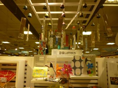 エスタの6階のフロアーでキイロが目印。1階から4階はビックカメラでそのままオナジエスカレータでのぼると、オシャレな雰囲気の売り場なのですぐに分かります。7月からさっそく夏のセールがはじまり混雑していました。涼しげな風鈴がたくさんありました。