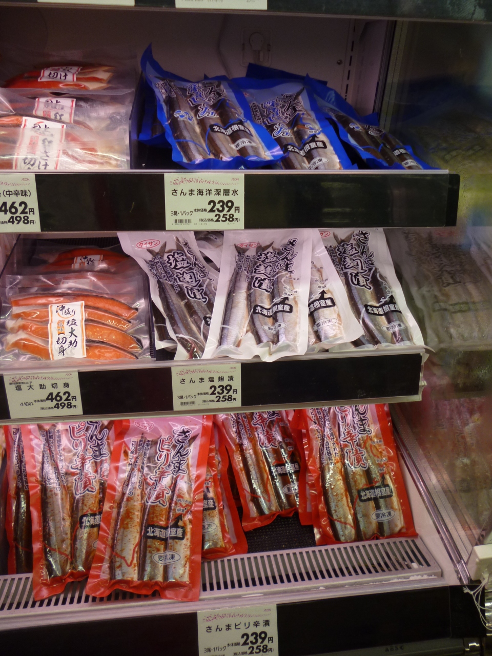 1階の鮮生食品売り場へサンマを買いに行きました。本場根室で水揚げされた新鮮なサンマを「ピリ辛味」でしたてた冷凍3匹パックが238円です。「ぬか漬け味」なもあり、種類が豊富です。魚だけでなく他も品揃えが豊富です。