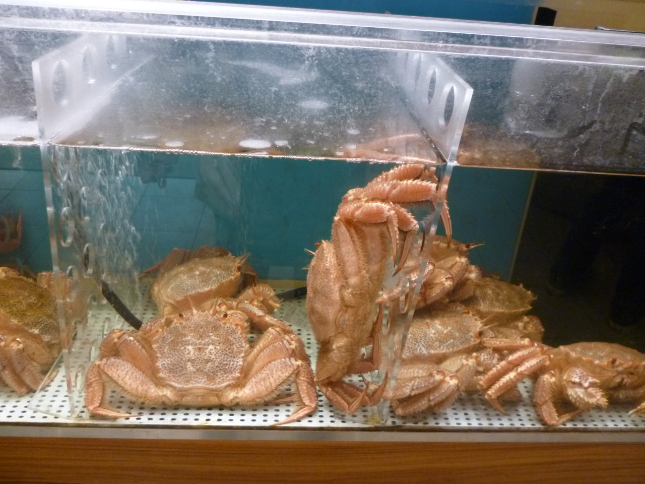 北海道のお土産は、イクラやウニ、サケなどの海産物が喜ばれます。ここで買って地方発送もできます。生きた毛ガニが元気良く泳いでいました。見ているだけでも楽しいです。新千歳空港の2階売店の奥の方にあります。