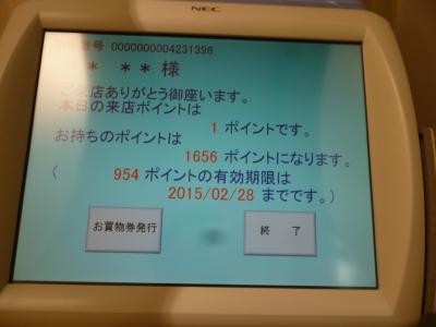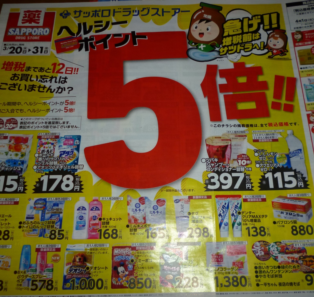 クスリのほかに食料品も扱っています。無料のポイントカードを作るとお得です。れじ袋をいらないというと、エコポイントがつきます。期間限定でポイント倍増の日があるんです。3月20日から31日まで12日間ポイントが5倍になります。増税前の買いだめするひとで混んでいます。