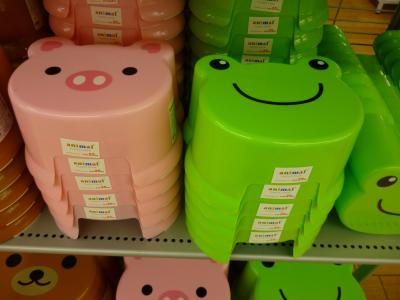 100円ショップをよく利用しますが、ダイソーの商品は可愛いものが多いです。最近の人気商品は、カエルやブタ、クマ柄のゴミ箱、お風呂で使う椅子などがあります。新商品は、次々とでてくるので見逃せません。(今のところは105円です)