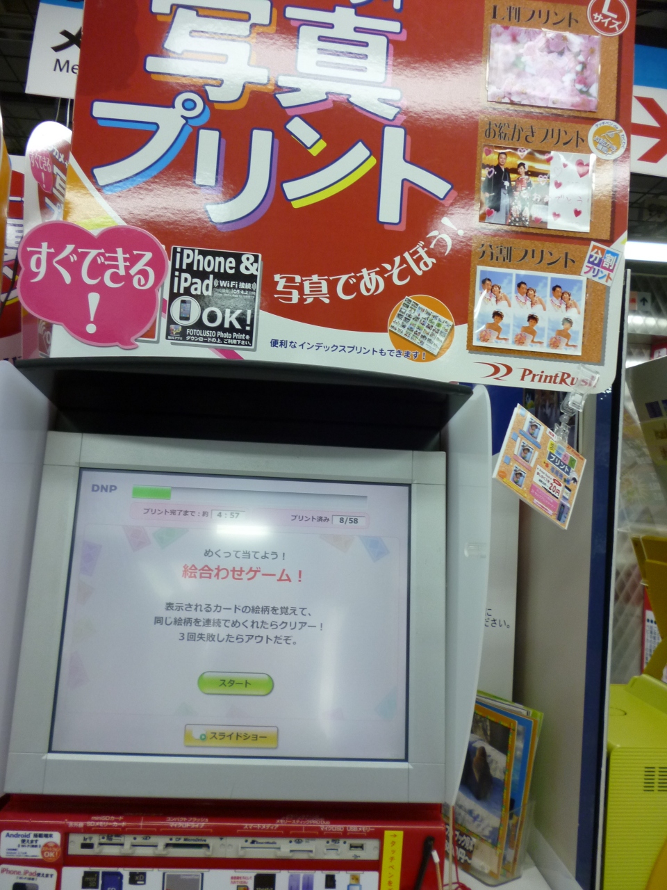 大阪観光をしてJRで京都へむかうのに、時間が少しあったのでヨドバシカメラへよりました。デジカメにたくさん写真を撮りすぎてしまって、削除するのはいやなので、「そうだプリントしてから削除しよう』と思いつき即実行しました。駅近くにあるヨドバシは本当に助かりますね。