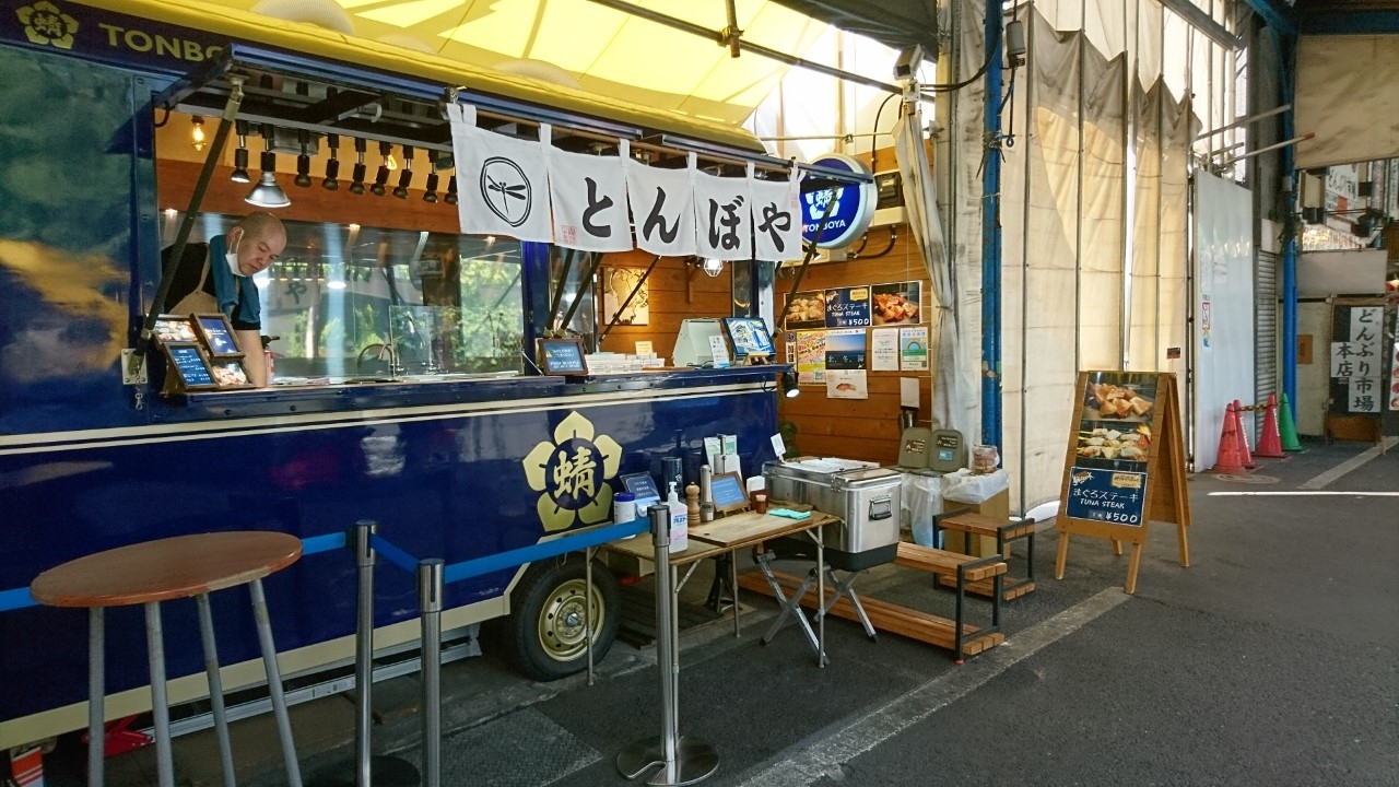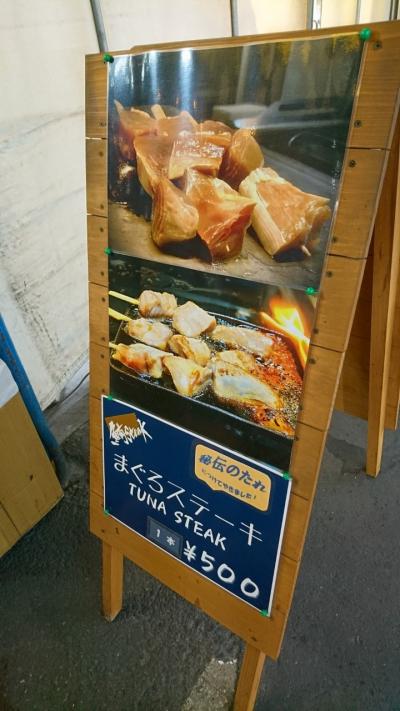 築地に最近できたお店だと思います。築地では珍しい軽トラ店舗です。新しい形態ですね。メニューは、マグロステーキが主です。しかも、安いです。串にささったマグロ焼きをコショウや七味をかけていただきます。脂がのったおいしいマグロです。生でも十分いただけると思います。火を通してなお、新鮮な感じです。食べ歩きができるので、ブレイクの予感がしました。