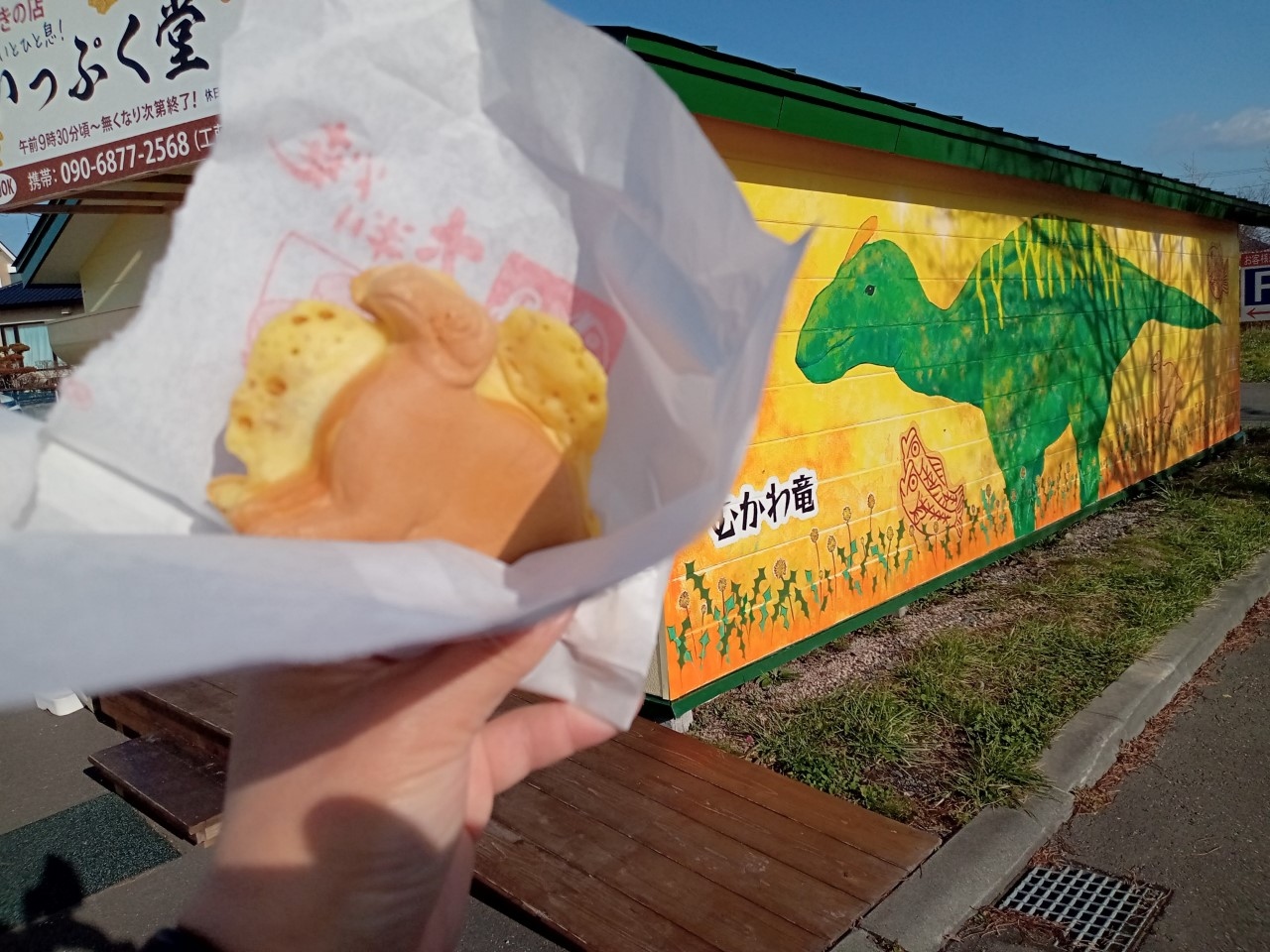むかわ町の道の駅、四季の館の向かいにあるたい焼き屋さんです。しかし、売っているのは、たい焼きではありません。恐竜の形をした「恐竜焼き」です。むかわは、鵡川竜という恐竜の化石が見つかった土地ですからね。中は、あんこかクリームの2種類です。恐竜焼きは、ふんわりとしていて食べやすいお焼きでした。他にも店内には、恐竜エキス?の入ったインスタントラーメンも売っていて町をあげて恐竜をPRしようと言う意気込みが感じられました。
