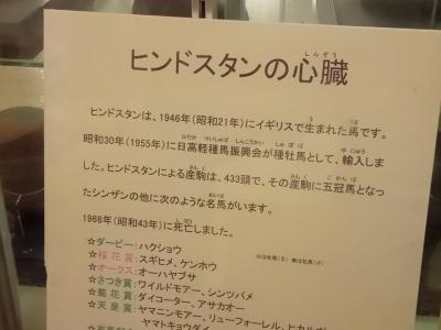浦河町の中心部から車で10分少々えりも町方面に行ったところにある馬の資料館です。馬の歴史が詳しくわかります。一番、多く展示されているのは、浦河町が生んだ5冠馬、シンザンに関連するものです。シンザン本人はいないものの、子どものミホシンザンや津父親のヒンドスタンのはく製がありました。さらに驚いたのが、ヒンドスタンの心臓が展示されていたことです。ビックリしました。他には、古い馬車や馬具もあり馬の歴史がわかります。
