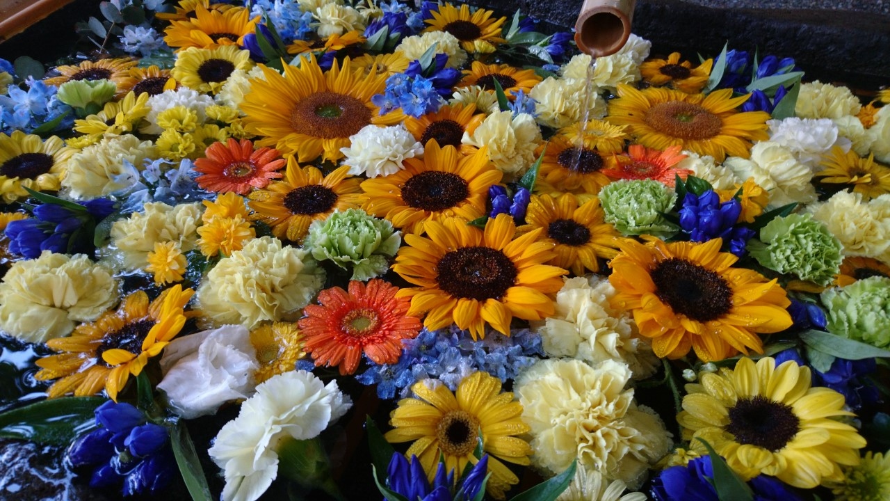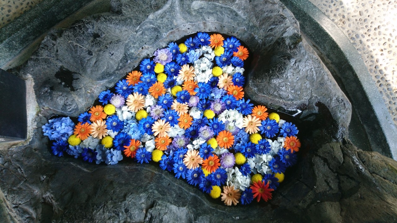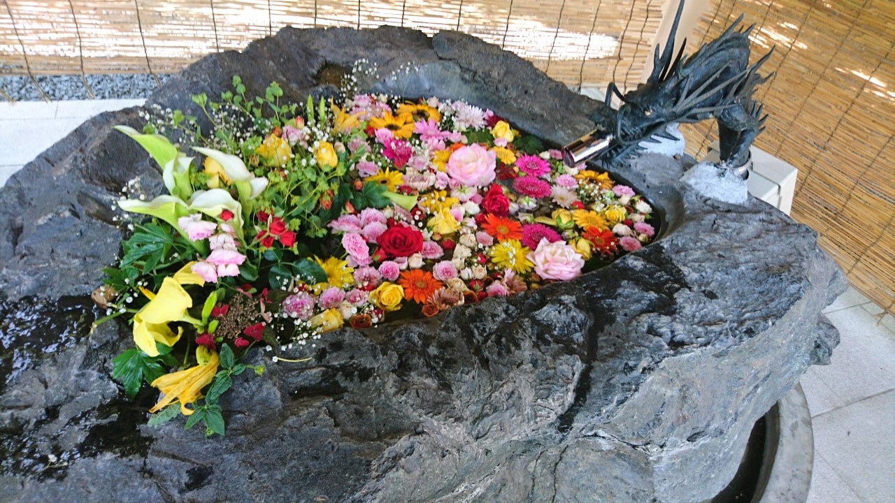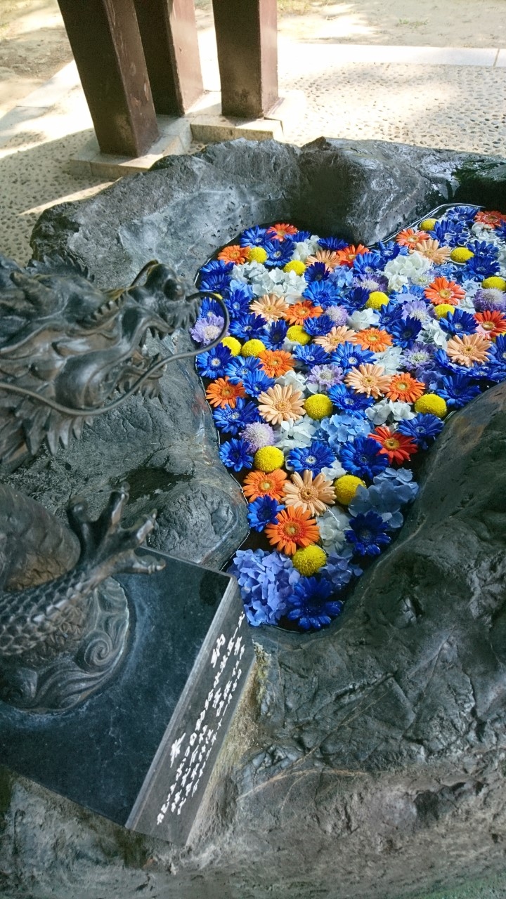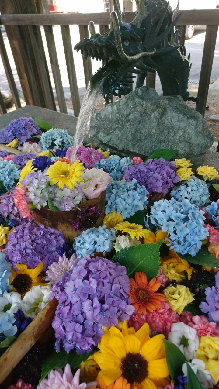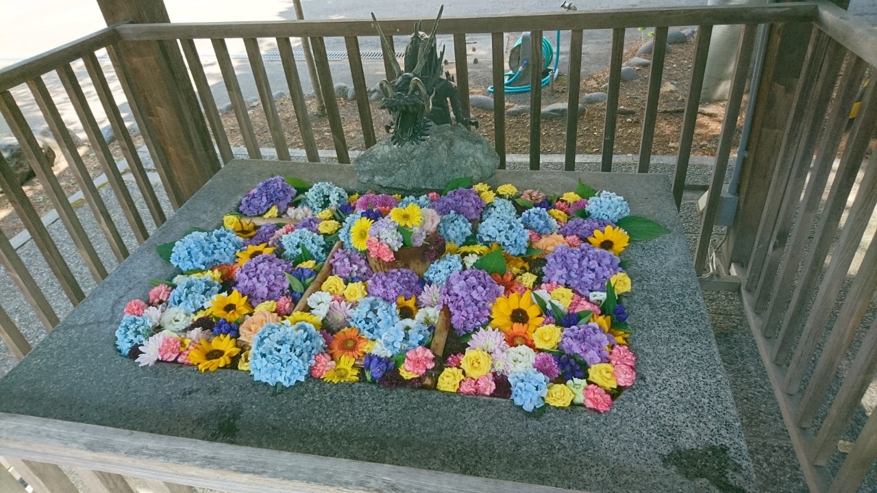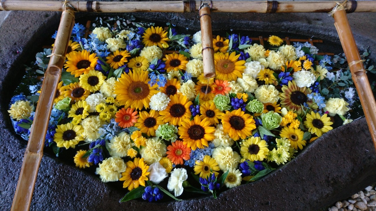 去年から始まった「花手水」。「花手水」とは神社でお参りする前に手や口を清める手水場を花で飾ることです。今年も、この「花手水」が催されるというので花詣に行きました。豊平神社は、骨董市が開かれるので、時々伺う神社です。この日は、骨董市は開かれていなかったのですが、「花手水」を見にたくさんの人がきていました。豊平神社の「花手水」は、黄色のヒマワリや青や紫のアジサイが生けられた季節を感じさせるものでした・大変うつくしく、落ち着いた気持ちになりました。