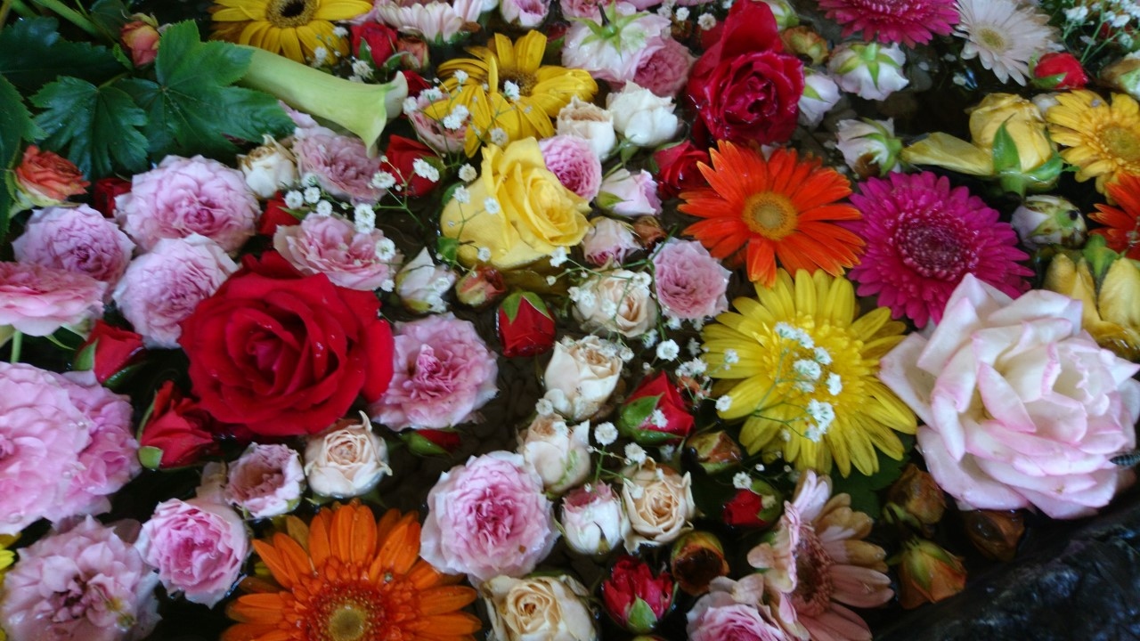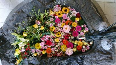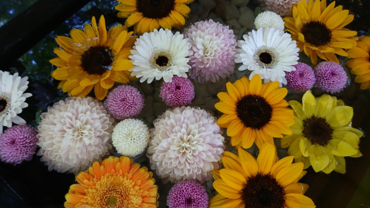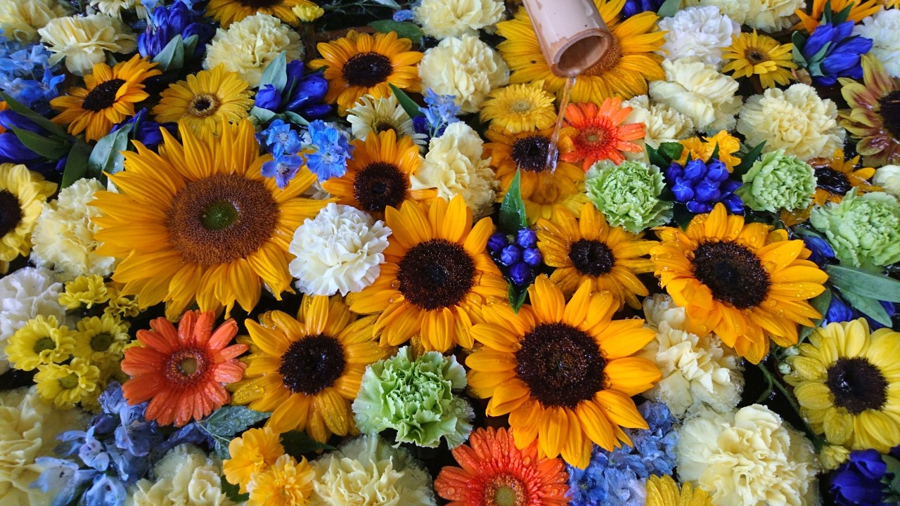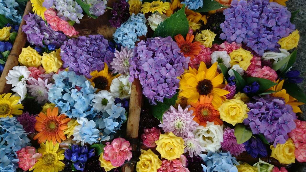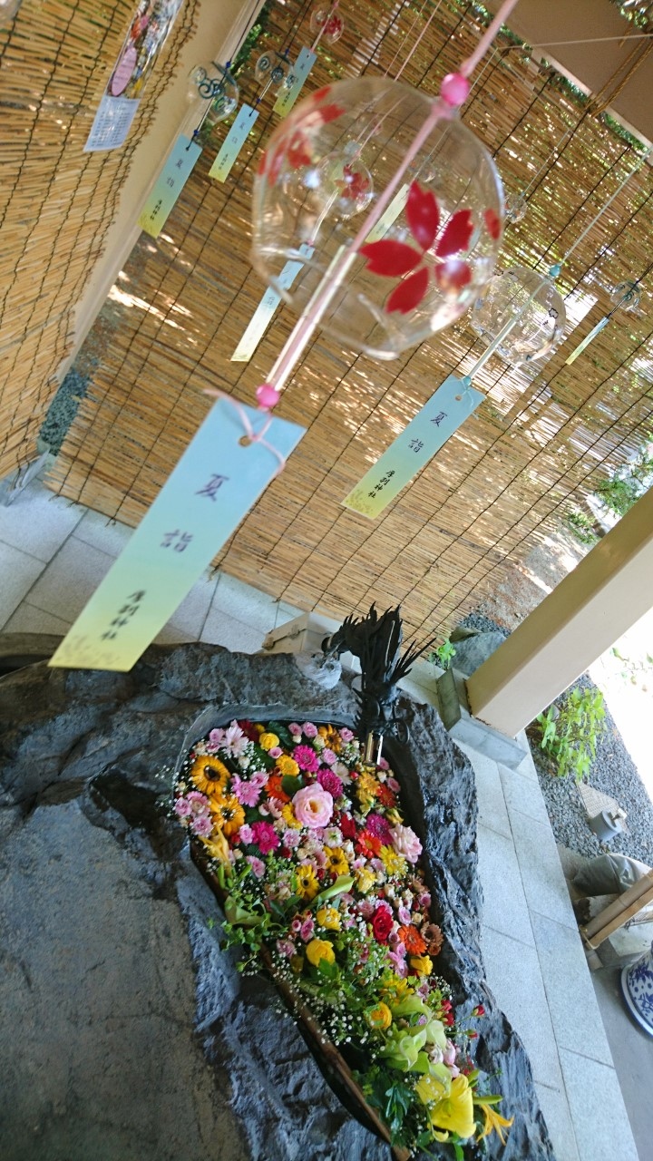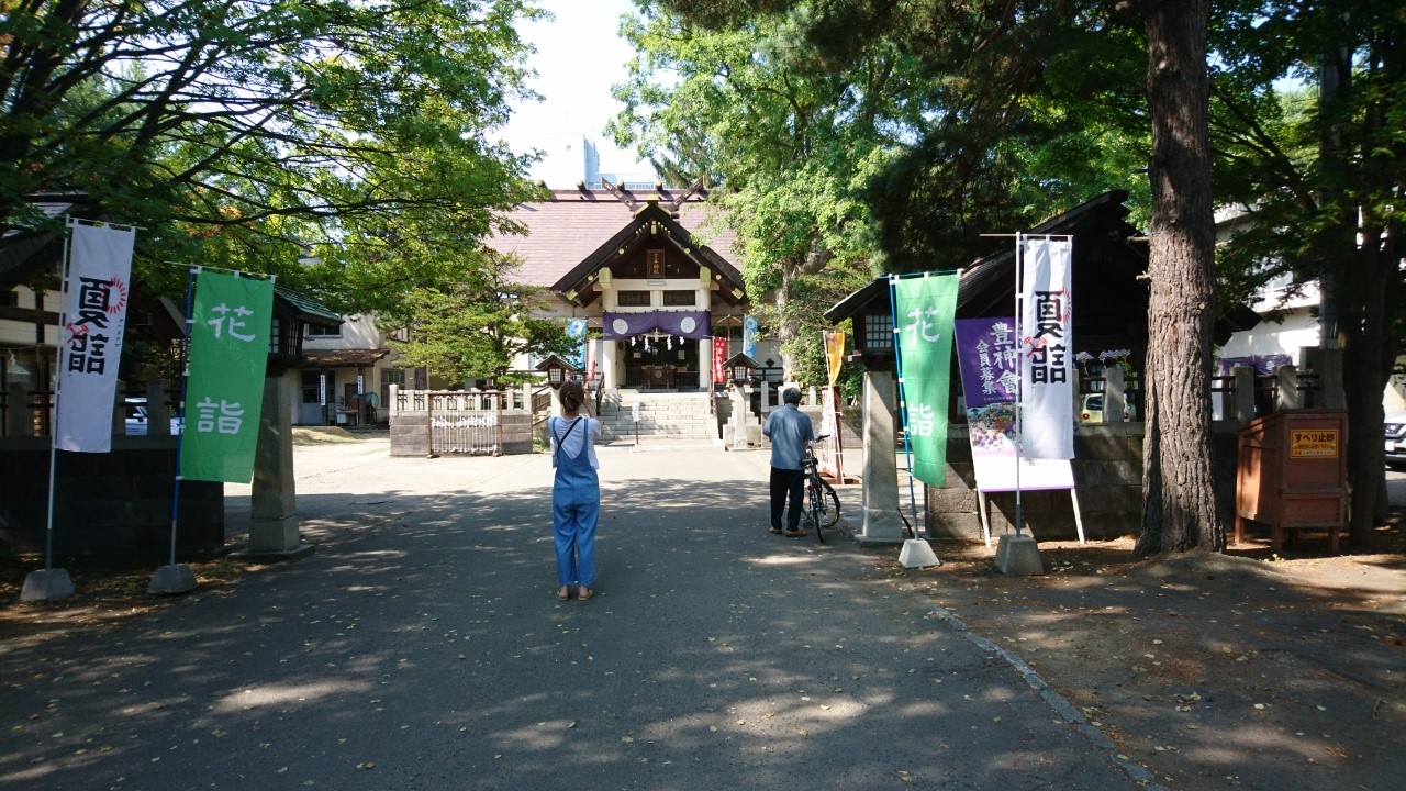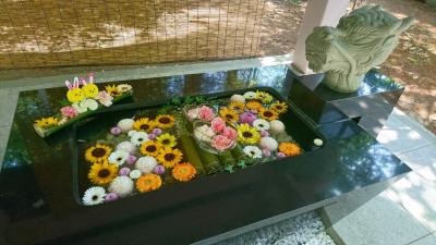 去年から始まった「花手水」。「花手水」とは神社でお参りする前に手や口を清める手水場を花で飾ることです。今年も、この「花手水」が催されるというので花詣に行きました。豊平神社は、骨董市が開かれるので、時々伺う神社です。この日は、骨董市は開かれていなかったのですが、「花手水」を見にたくさんの人がきていました。豊平神社の「花手水」は、黄色のヒマワリや青や紫のアジサイが生けられた季節を感じさせるものでした・大変うつくしく、落ち着いた気持ちになりました。