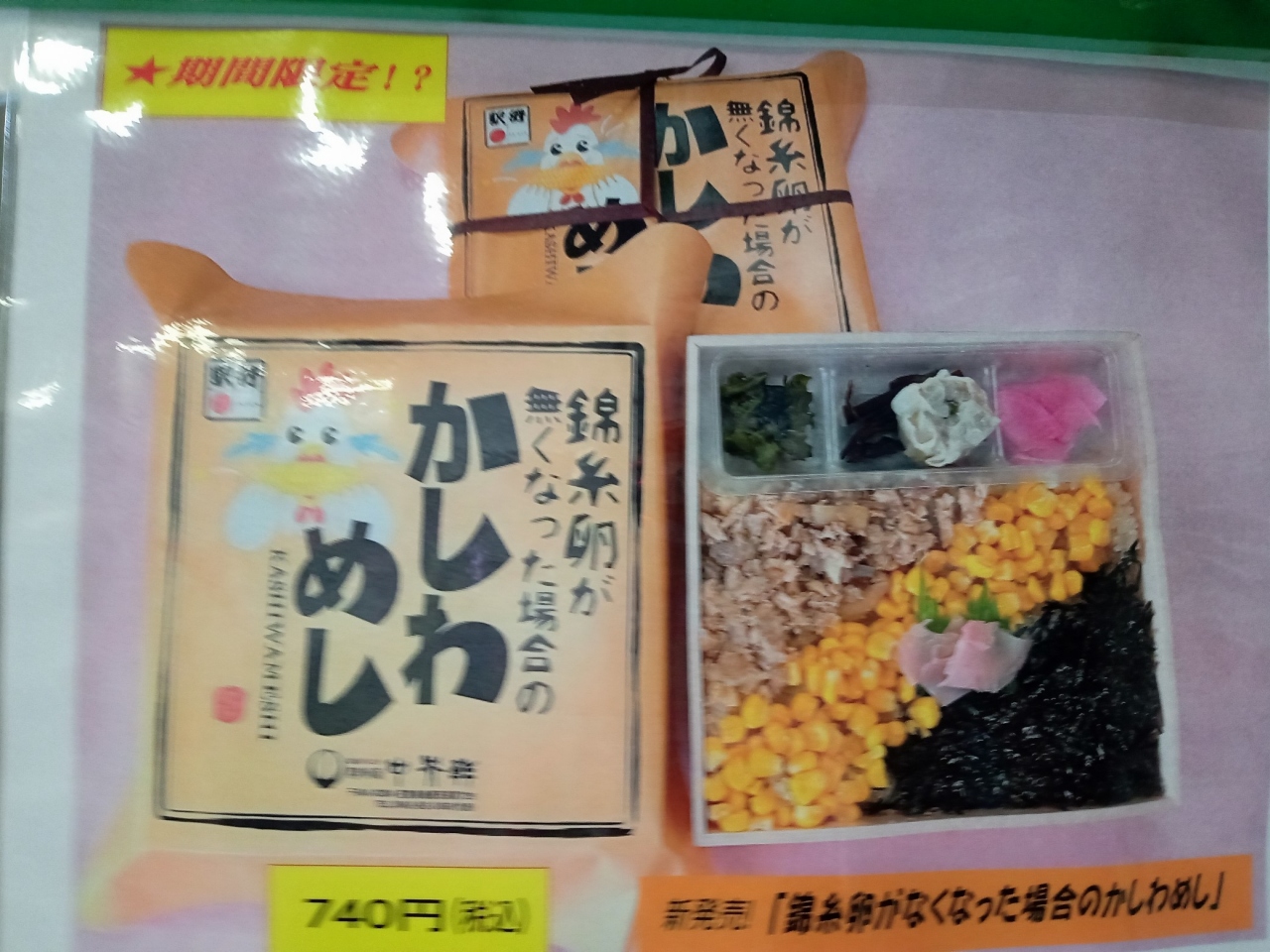 鳥栖駅にある小さな食堂です。今回は、SL人吉号に乗るために鳥栖にやってきました。昼を過ぎ、おなかがへりましたが、あまり時間がなく、ここでお弁当を買いました。鳥栖なので「かしわめし」を購入しました。軟らかく煮た鶏肉が入ったご飯です。錦糸卵もおいしく良い思い出になりました。