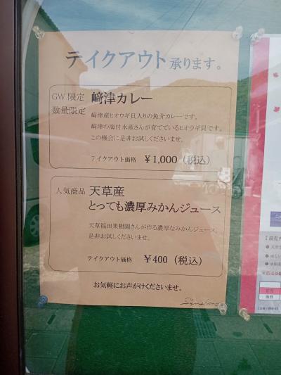 天草の世界文化遺産にもなった崎津にあるレストランです。主にパスタなどのイタリアンです。この日は、テイクアウトで飲み物をいただきました。濃厚ですがさっぱりとしたオレンジジュースです。これを飲みながら崎津教会や洋上のマリア様などを見て歩きました。