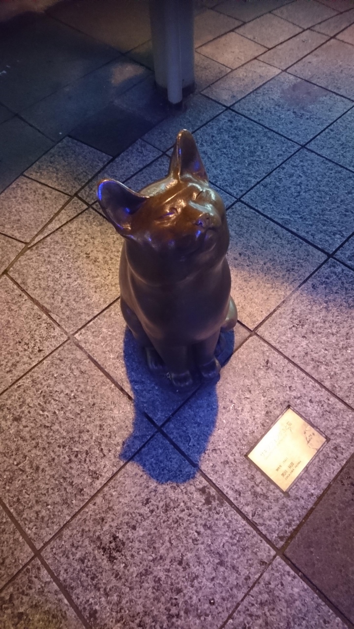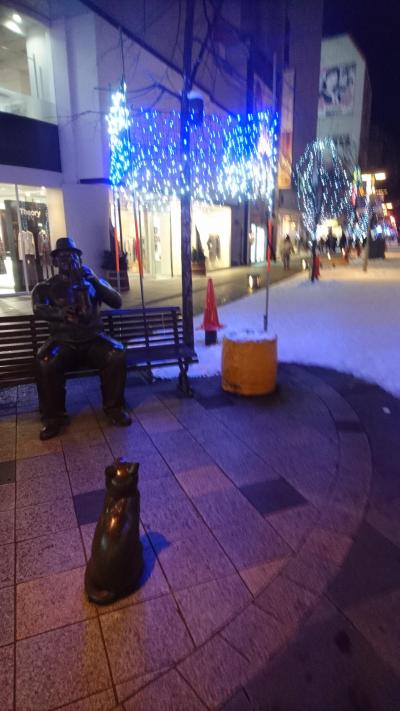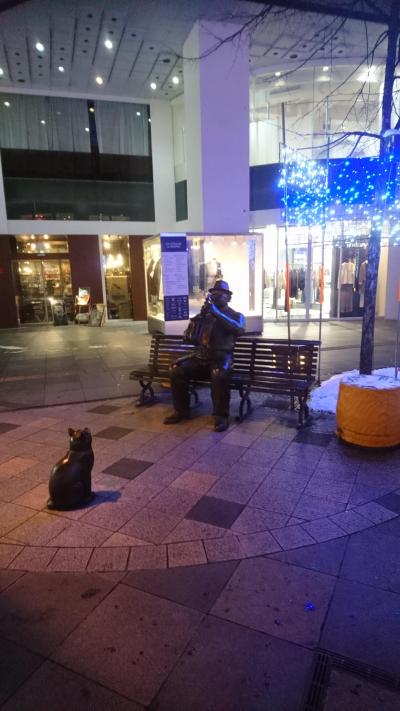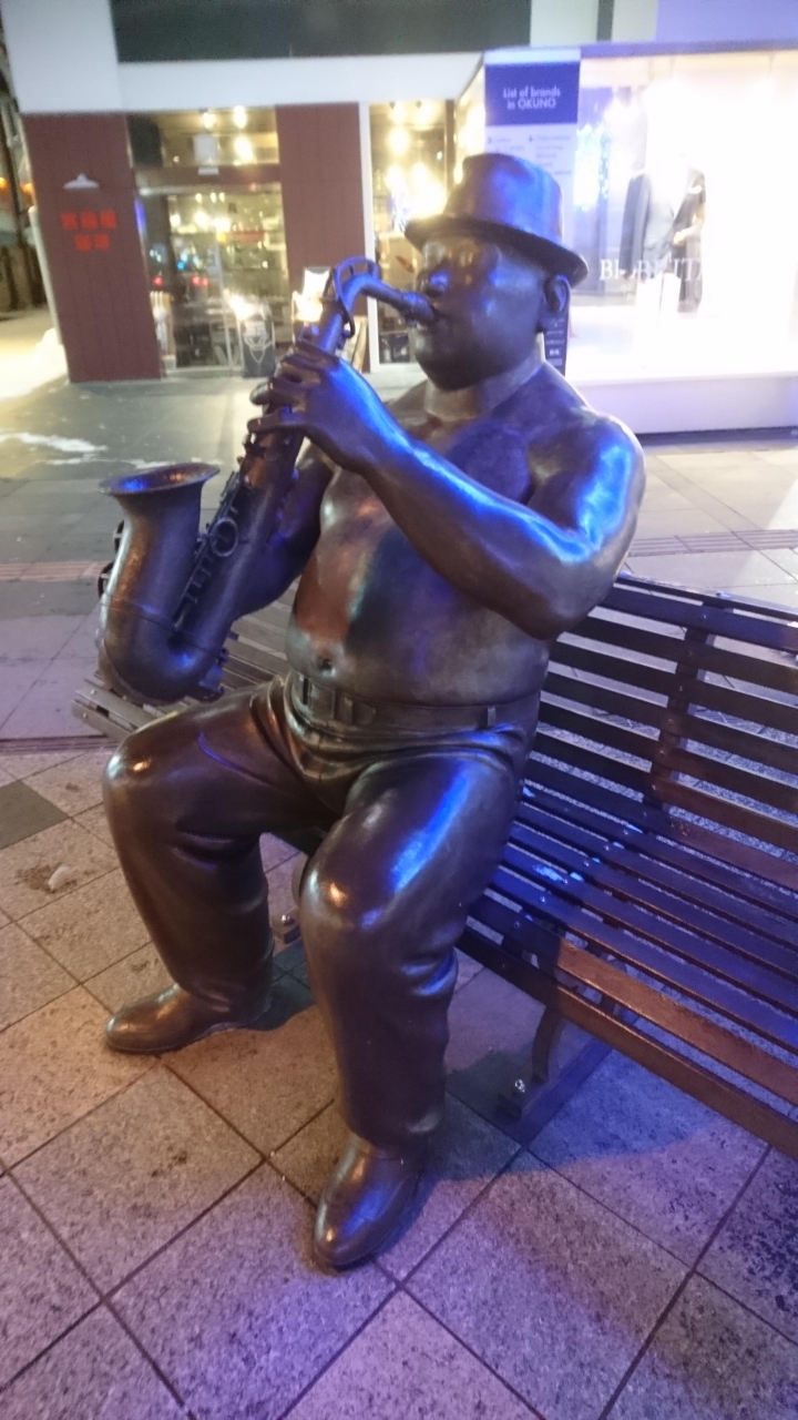 旭川の平和通買物公園にある彫刻です。買物公園は、彫刻が多いのですが、その中でも、ひときわ市民や観光客に親しまれている彫刻です。冬でも、サキソフォンを吹くおじさんの横に座り、記念写真を撮っている人が多いです。いつまでもお元気で。ネコちゃんも、カゼをひかない様にねと語りかけてしまいます。