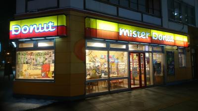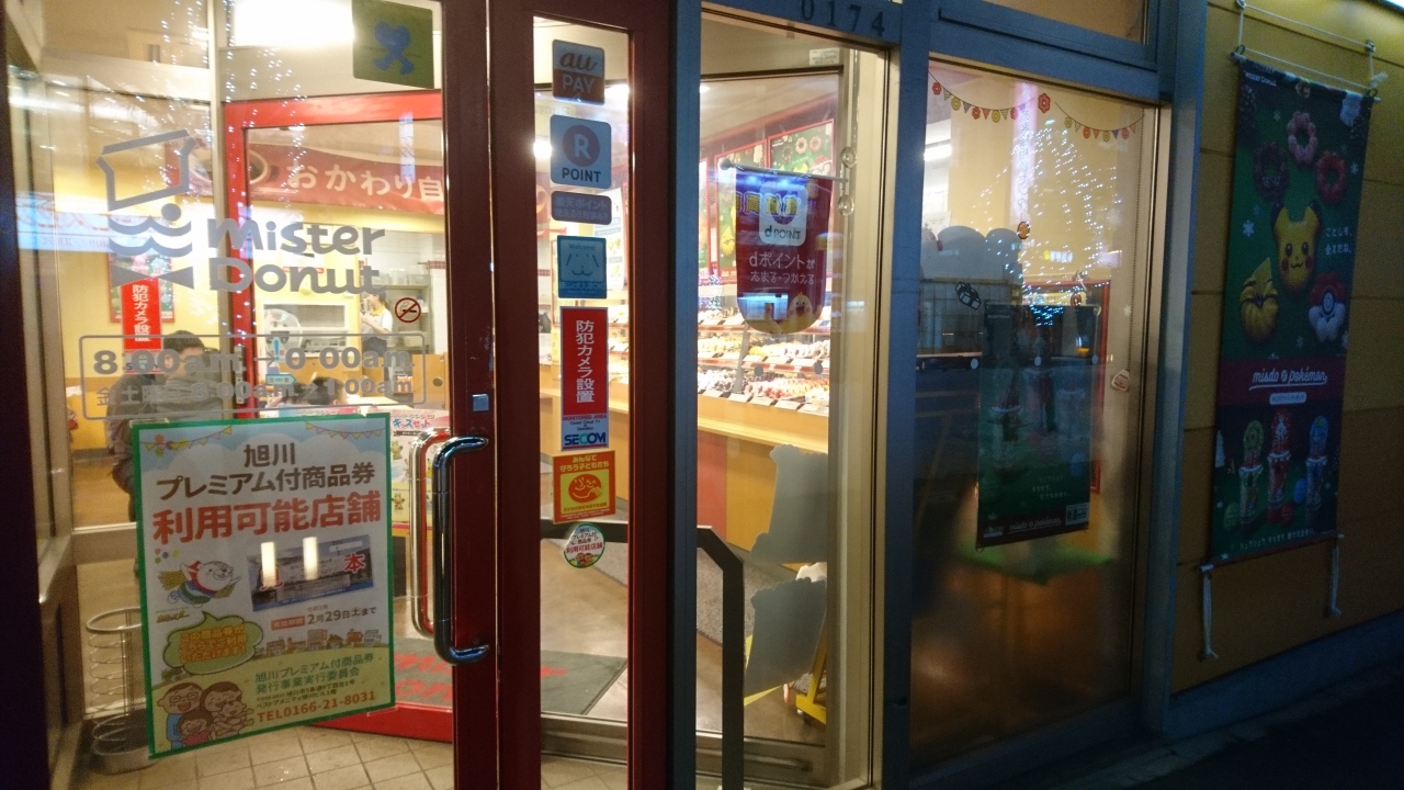 旭川の平和通買物公園に面しているミスドさんです。近くの巨大ショッピングモールには、スタバさんもあるのですが、相変わらず混んでいますね。コスパが良いですからね。コーヒーをいただきながら見る買物公園は、また格別なものがあります。いつまでも続けてください。