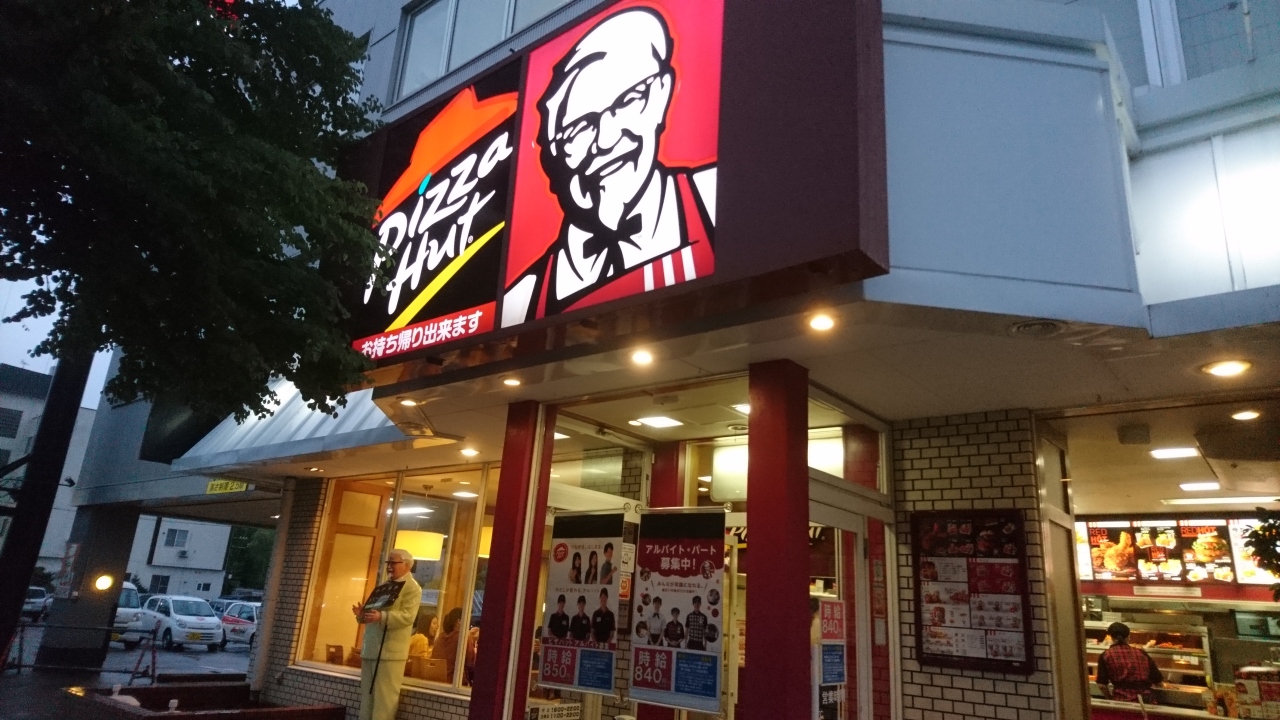 網走のバスターミナルに近いところにあるピザハットさんです。ここは、ケンタッキーフライドチキンさんと隣り合わせというか同じところにあります。つまりチキンをいただきながら、ピザも味わえるという、最高の場所です。このようなところは、珍しいですね。しかし、店を出るときには、「なぜ、他の土地にも、このようなところがないのか、