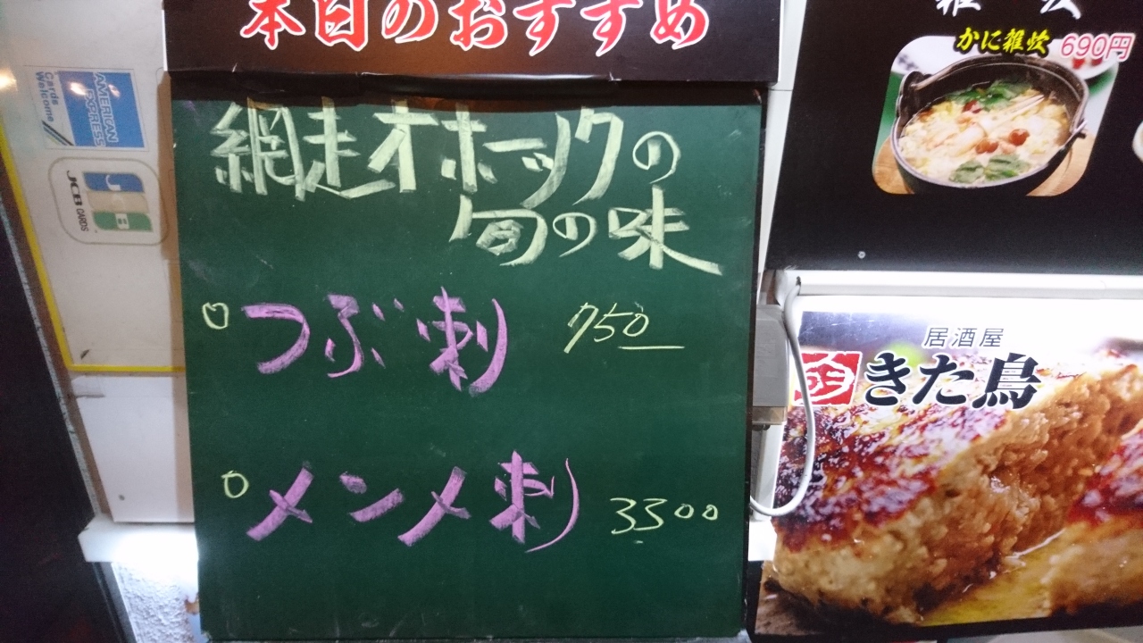 網走の飲食店街にある居酒屋さんです。外観は、目立ちませんが、中に入ると満席状態で人気の居酒屋さんです。特に刺身が最高で、新鮮な魚介類が並んでいました。特に、ホッケの刺身は、他ではいただいたことがなく、とてもおいしかったです。地元の人に愛された人気の居酒屋さんなので、混んではいますが、おすすめのお店です。