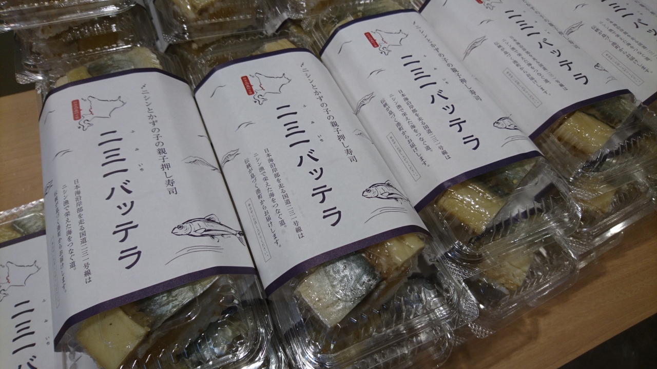 石狩の厚田地区にできた新しい道の駅の2階にあるお店です。ここの名物は、「ニシンのバッテラ」です。昔、石狩市はニシンで栄えた地域、今も鰊番屋が残っています。その特産品を生かしたグルメがこれです。ニシンが上にのったバッテラで、ご飯の中には数の子が入ったぜいたくな一品です。ご飯の味としめたニシンがとってもマッチしています。数の子の食感もよく、とてもおいしい新名物です。他にも、安いマグロ丼などもあり、お買い得です。