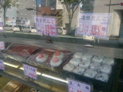 前橋駅から歩いて5分少々。かつての商店街と思われる場所の入り口にあります。「団子の…」とありますが団子だけでなく、お弁当やお寿司などもあります。官公庁にも近い、街の中心部にあるのでサラリーマンや学生が朝から立ち寄っています。この日は、8時に行ったのですが、お寿司など一部の商品は、すでに売り切れ。買おうと思ったら、少し早い時間に行かなくてはありません。