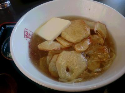 渋川観光なんて渋すぎますね。そんな渋川市を訪れた際、タクシーの運転手さんに勧められたのが、このラーメン店です。何が名物なのか聞くと、「ポテトラーメン」と言います。「?」がいっぱいですが、その「ポテトラーメン・味噌味」を注文。出てきたラーメンを見て衝撃。揚げたジャガイモがたくさん入っていました。その量がとても多いのです。ラーメンを食べるというより、ジャガイモを食べる感じです。ジャガイモの量の多さが半端ありませんでしたが、なんとか完食しました。