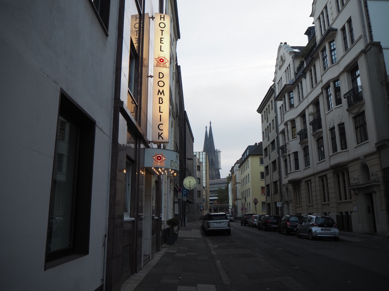 ケルン中央駅から、大聖堂とは反対側の出口を出て歩いて5分位の所にあり、ゴロゴロ転がしながら歩いて行けます。夜の通りが多少暗めですが、危険な感じはありません。