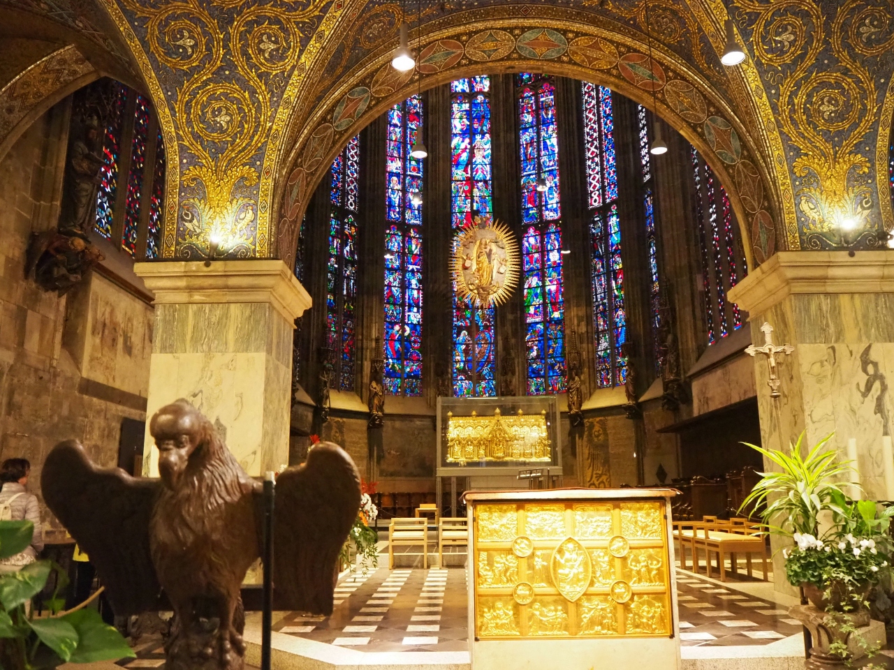 アーヘン中央駅から歩いて10分強。外観のデザインもいいですが、中のステンドグラスで覆われたガラスの礼拝堂がとにかく圧巻です。これだけを見にいくためにアーヘンに行く価値があると思います。