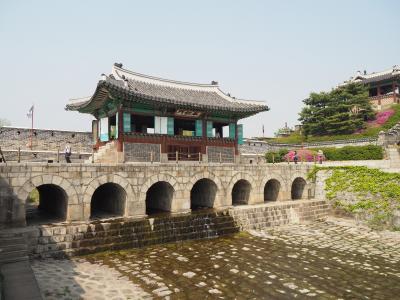 水原華城の正門である長安門より、城壁沿いに東に向かい川の流れる所にある水門で、7つの水門から溢れ出る水しぶきが虹のように輝いて見えることから、その名が名付けられたとの事ですが、水は殆ど流れていませんでした。