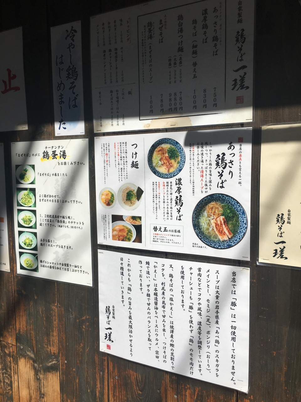 豚は一切使っていませんとの謳い文句で、メニューはアッサリとこってりの2種プラスつけ麺といったラインナップ。この店の原点と書かれていたあっさり鶏そばを注文。鶏の臭みは無く、あっさり塩味が夏にピッタリでとても美味しかったです。また鶏そばと合わせて出される柚子胡椒がいいアクセントとなっていました。個人的には柚子胡椒必須です。