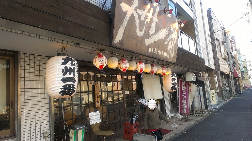 黒っぽい重厚な店構えに、白と青の看板が映えます。