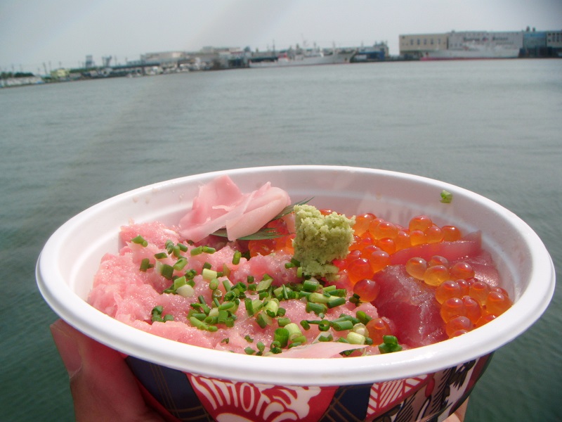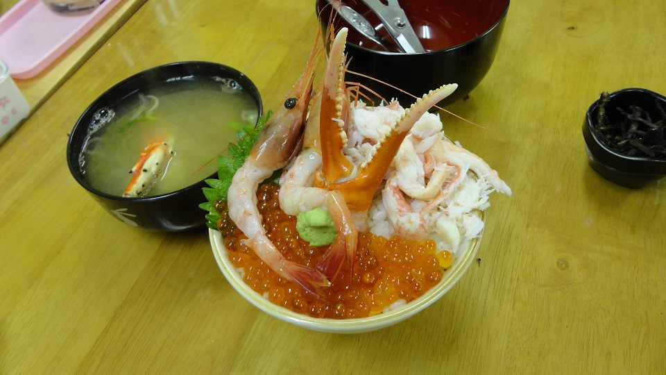 注文したのは、【カニ爪・イクラ丼】ですが、サービスで【イカスミ・スルメ】がつき、さらに! たまたま隣に居合わせた地元のおばちゃん(初対面)と世間話をしていたら、おばちゃんが頼んだ【カニ汁】をいただきまして、実に豪華なランチになりました。