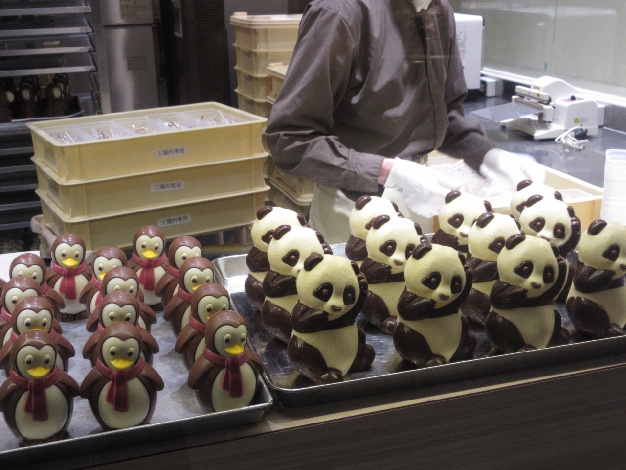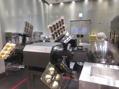 ロイズチョコから始まり、ハローキティ、そしてドラえもんワールドという順番に並んでいますが、このロイズチョコワールドでは、商品販売はもちろん、ここにある工場で製品を作っていて、その製造工程を ガラス越しに 誰でも見学可能。